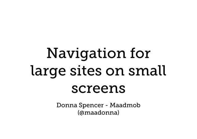 This presentation will explore the navigation challenge for large sites being used on small screens. It will go back to first principles and look at the purpose of various navigation types then explore ways of achieving the same goal via a small space.