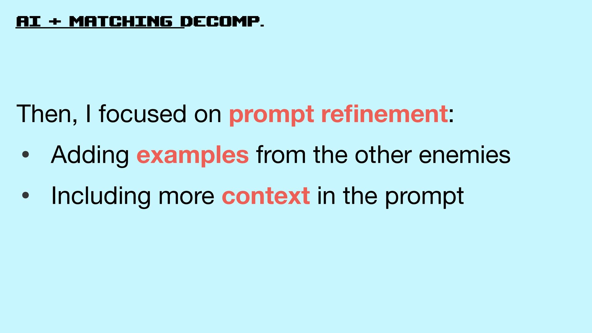fi nement: • Adding examples from the other enemies • Including more context in the prompt