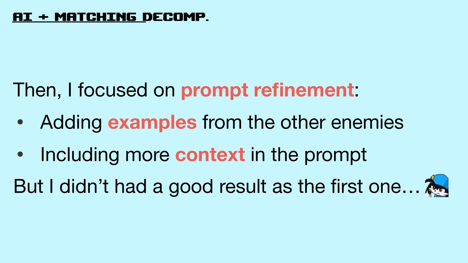 fi nement: • Adding examples from the other enemies • Including more context in the prompt But I didn’t had a good result as the fi rst one…