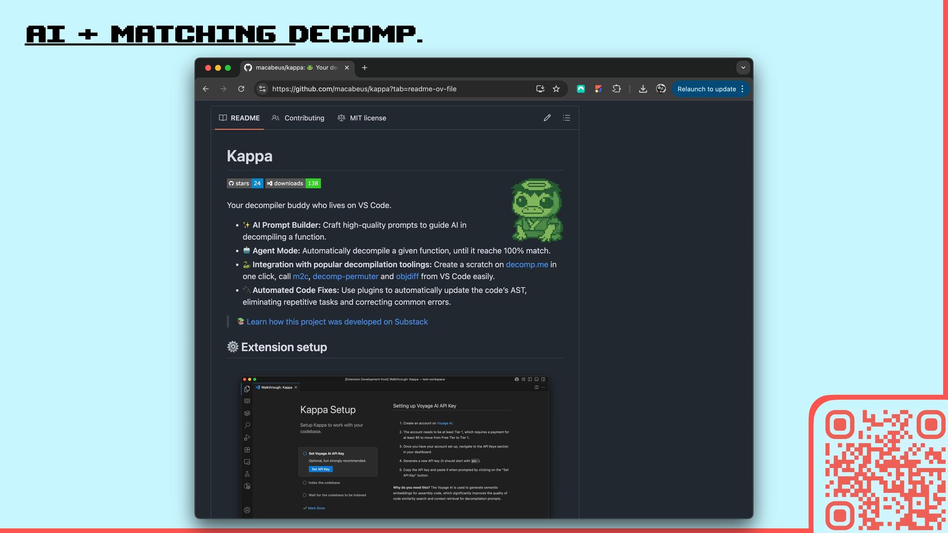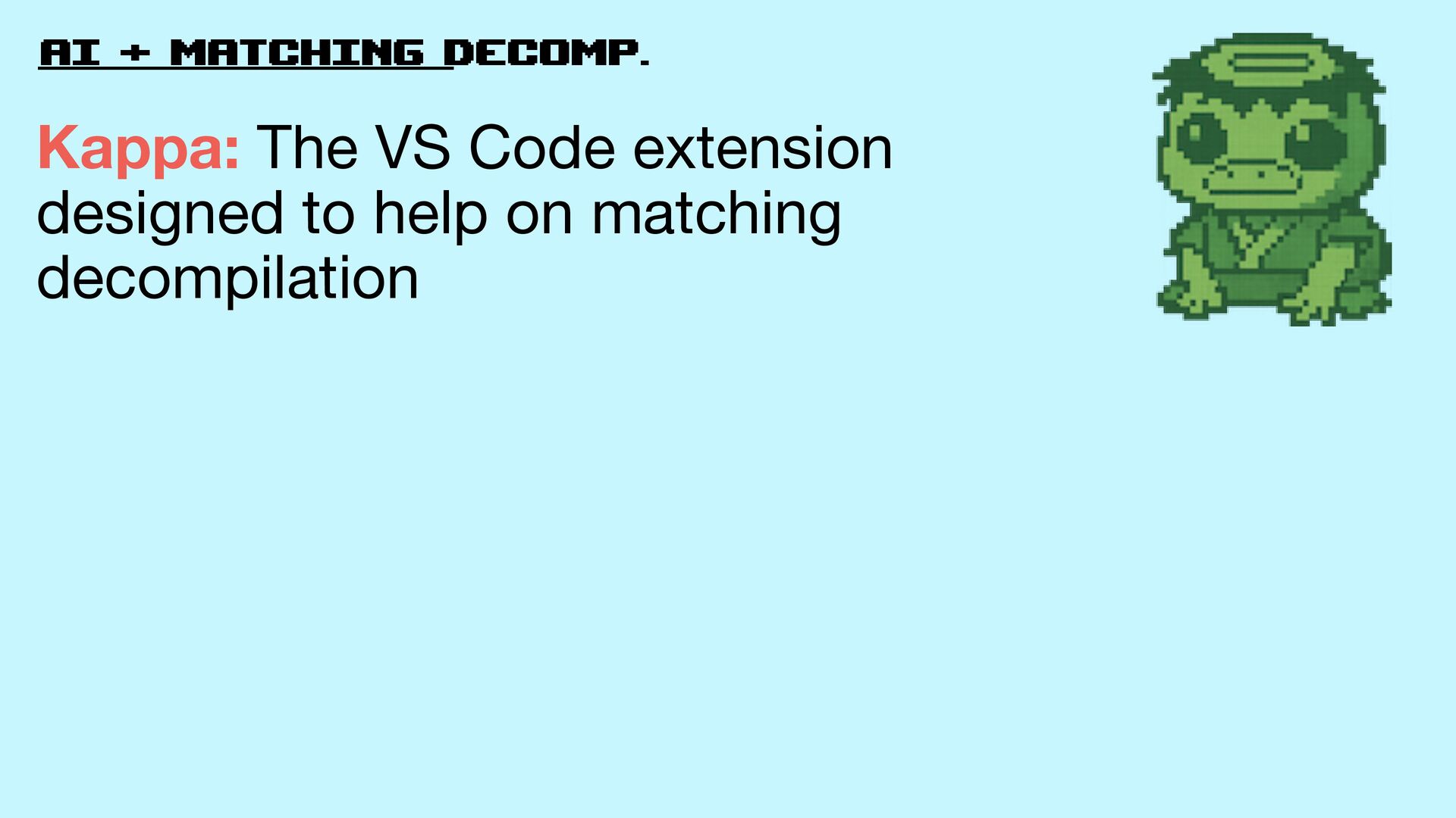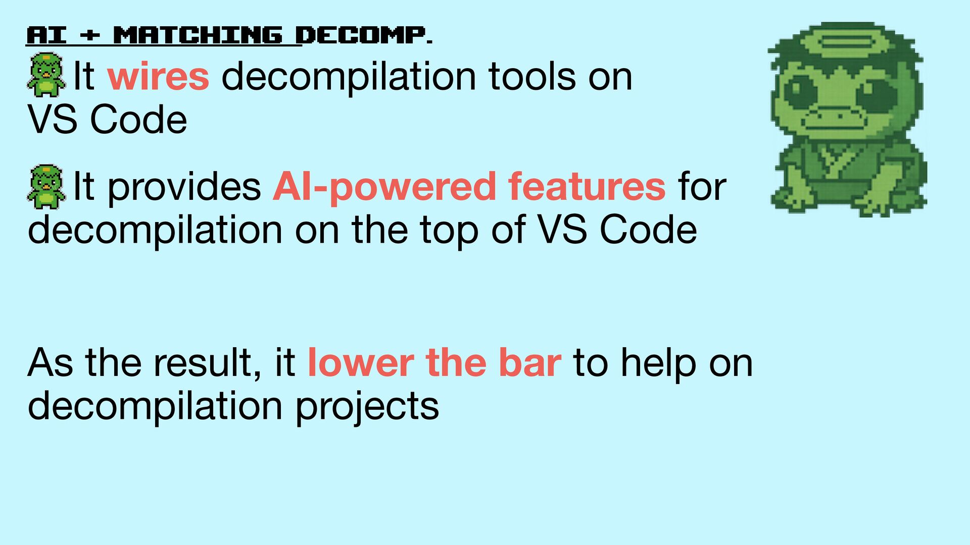 Code It provides AI-powered features for decompilation on the top of VS Code As the result, it lower the bar to help on decompilation projects