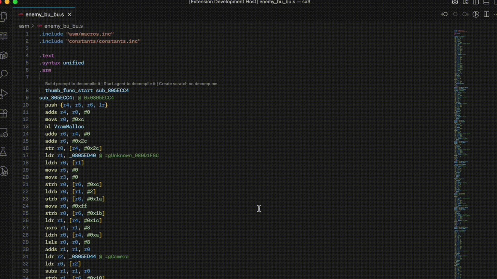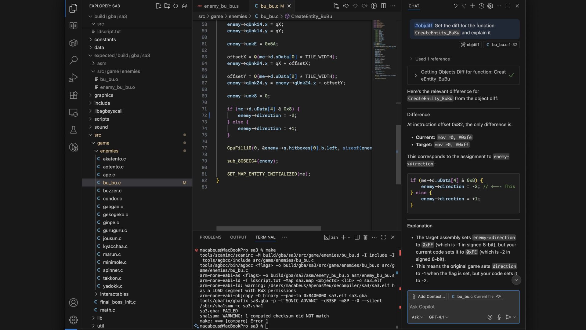 (Object fi le with the current assembly from your C source):** `/path/sa3/build/bu_bu.o` **Target Object (Object fi le with the target assembly that you want to match):** `/path/sa3/expected/bu_bu.o` **Function Name:** `sub_805ECC4` ## Current Object Assembly