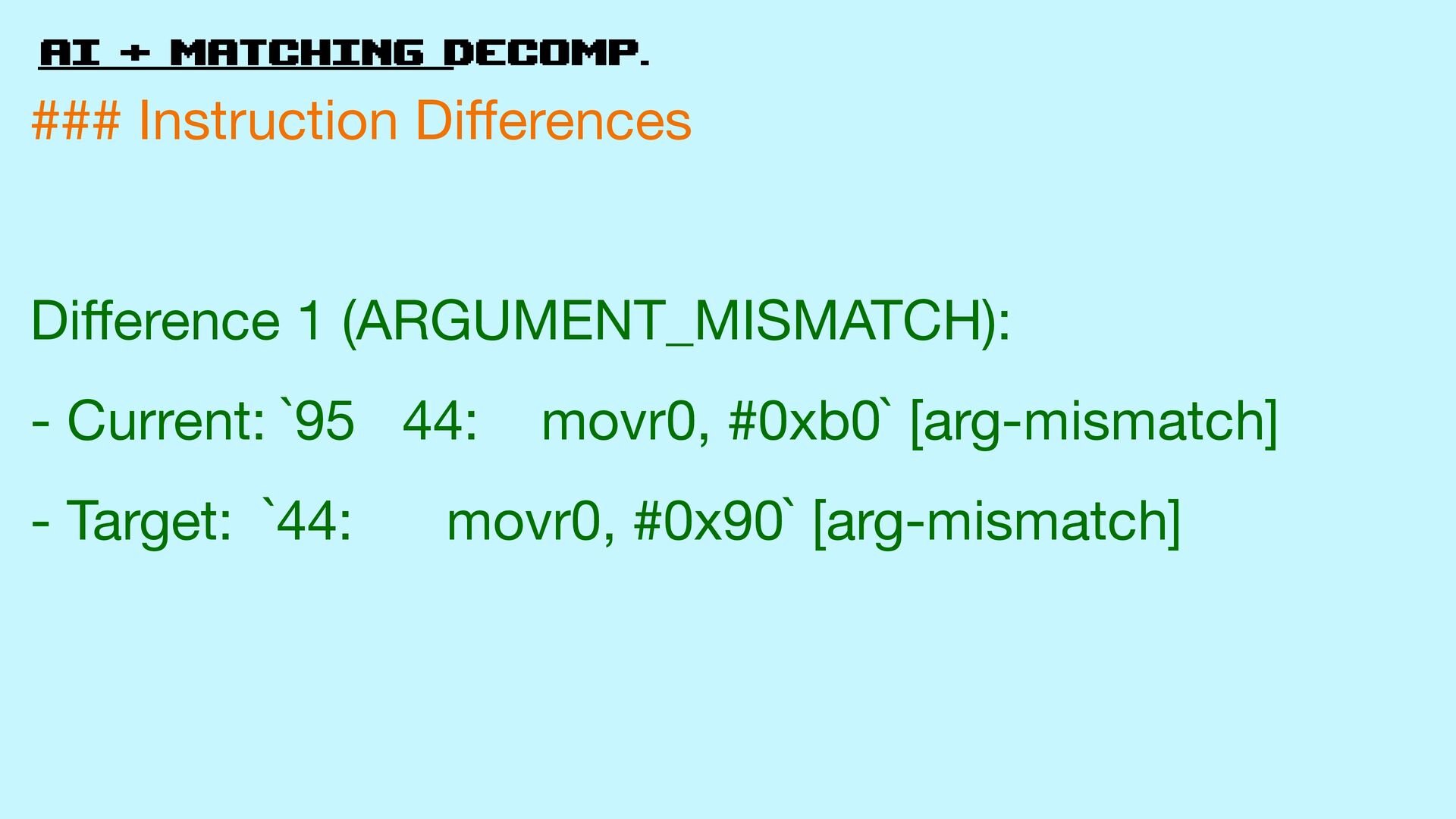ff erence 1 (ARGUMENT_MISMATCH): - Current: `95 44: movr0, #0xb0` [arg-mismatch] - Target: `44: movr0, #0x90` [arg-mismatch]