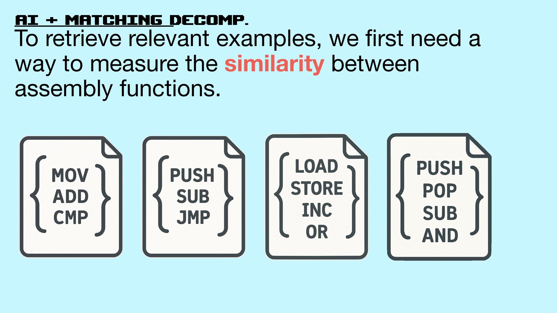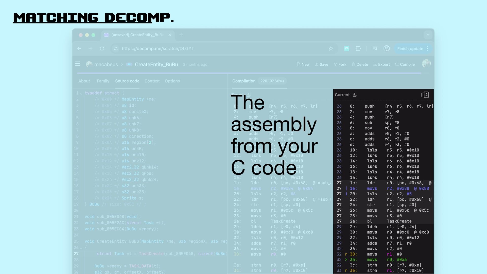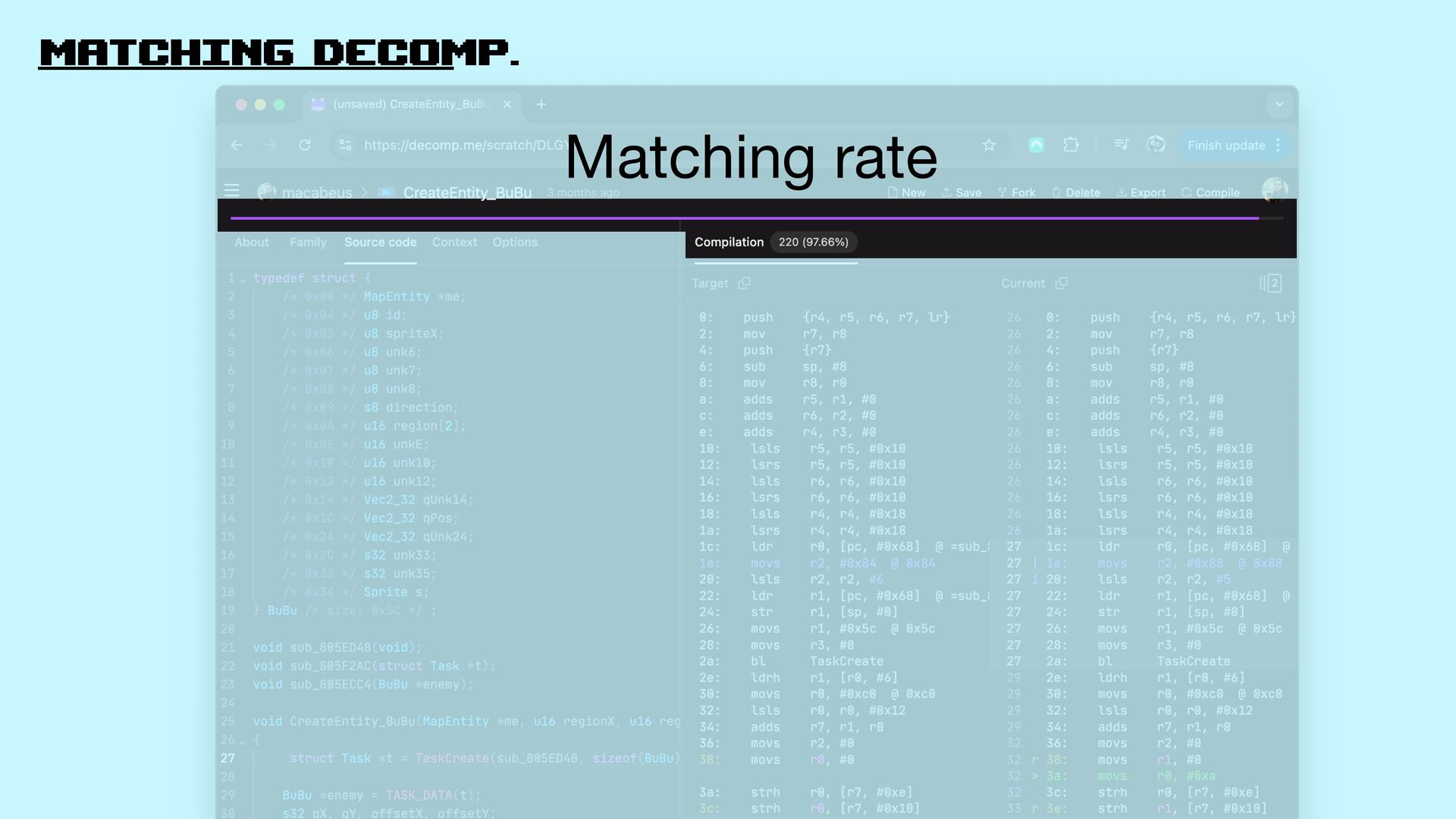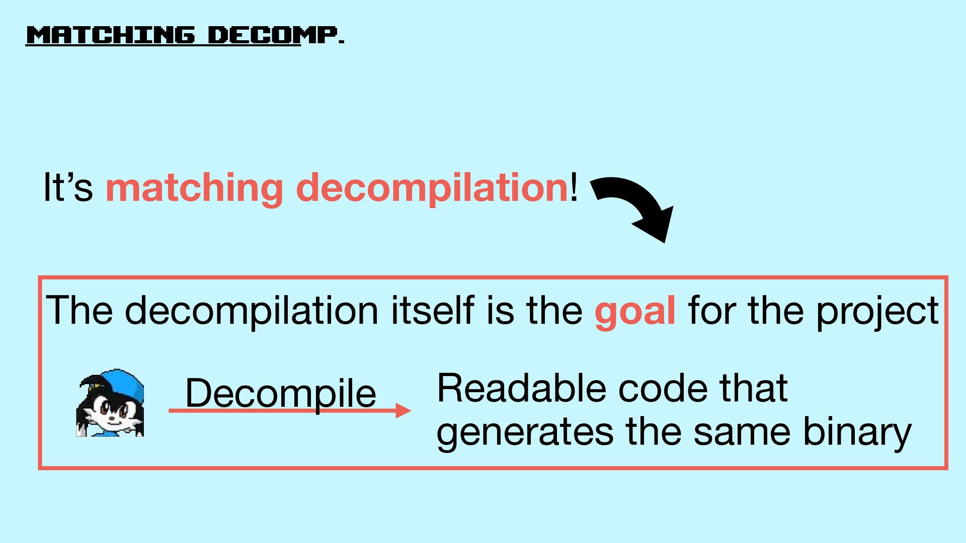 21. matching decomp. It’s matching decompilation! Decompile Readable code that generates