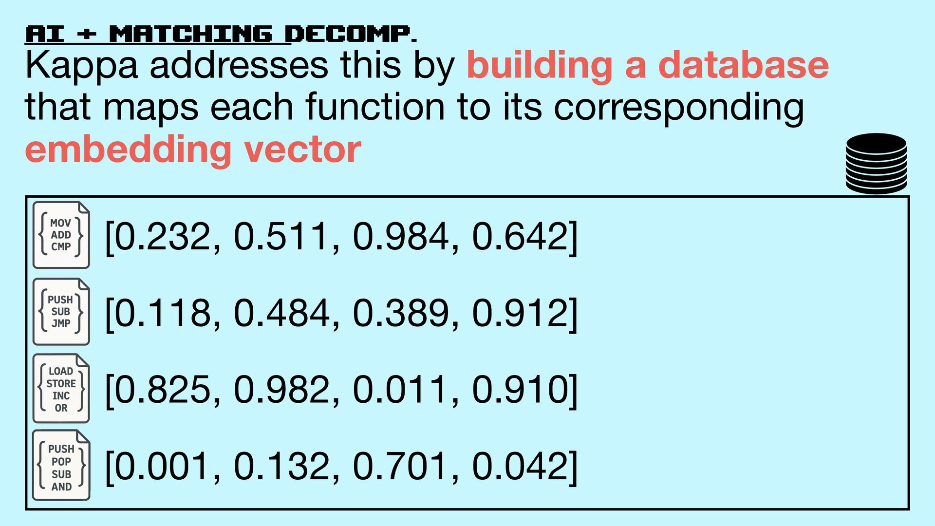 database that maps each function to its corresponding embedding vector [0.232, 0.511, 0.984, 0.642] [0.118, 0.484, 0.389, 0.912] [0.825, 0.982, 0.011, 0.910] [0.001, 0.132, 0.701, 0.042]