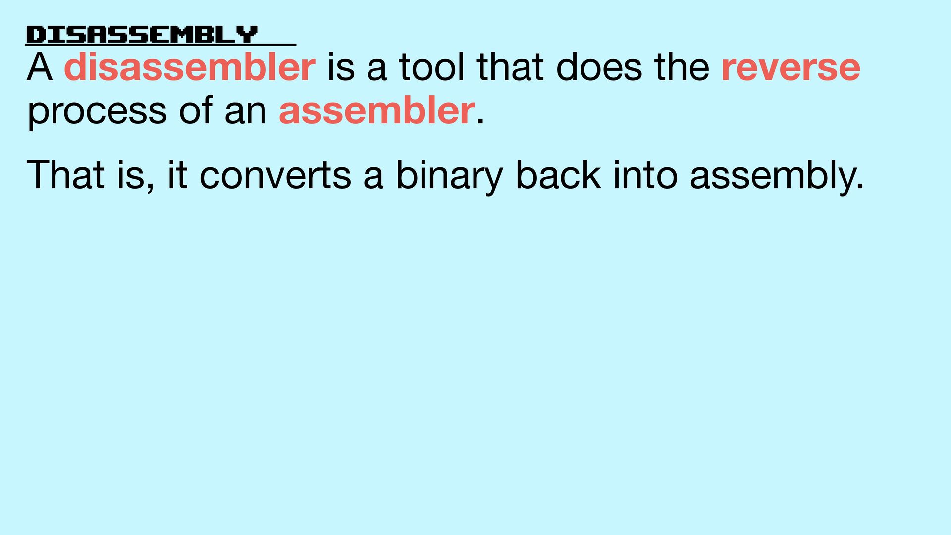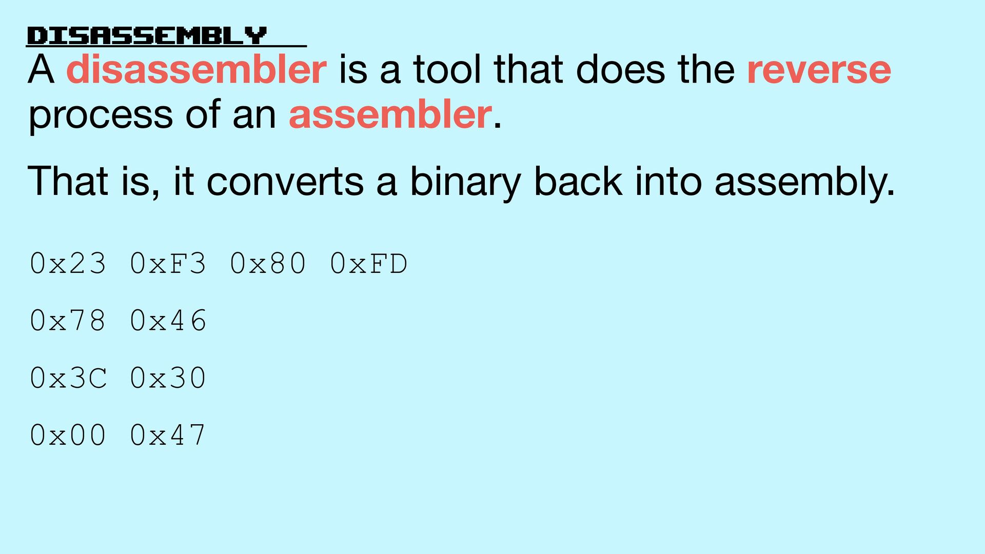 0x47 A disassembler is a tool that does the reverse process of an assembler. That is, it converts a binary back into assembly.