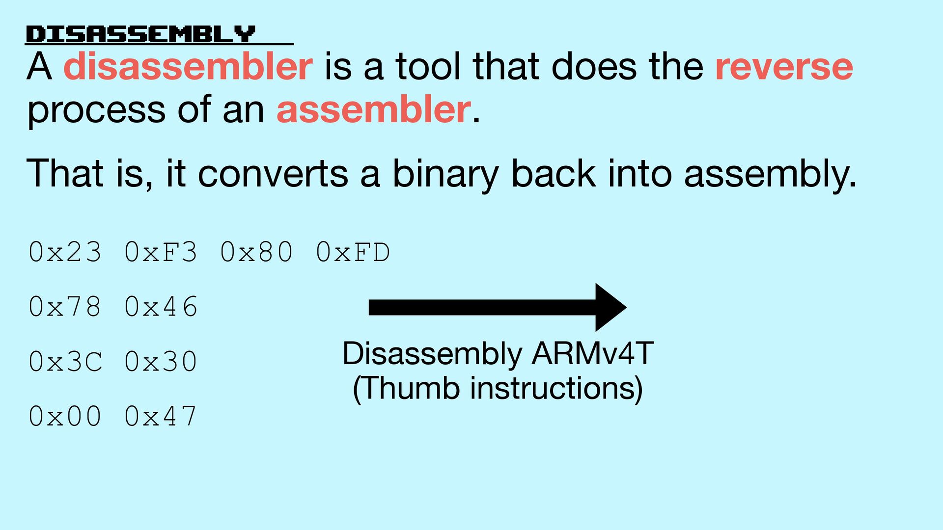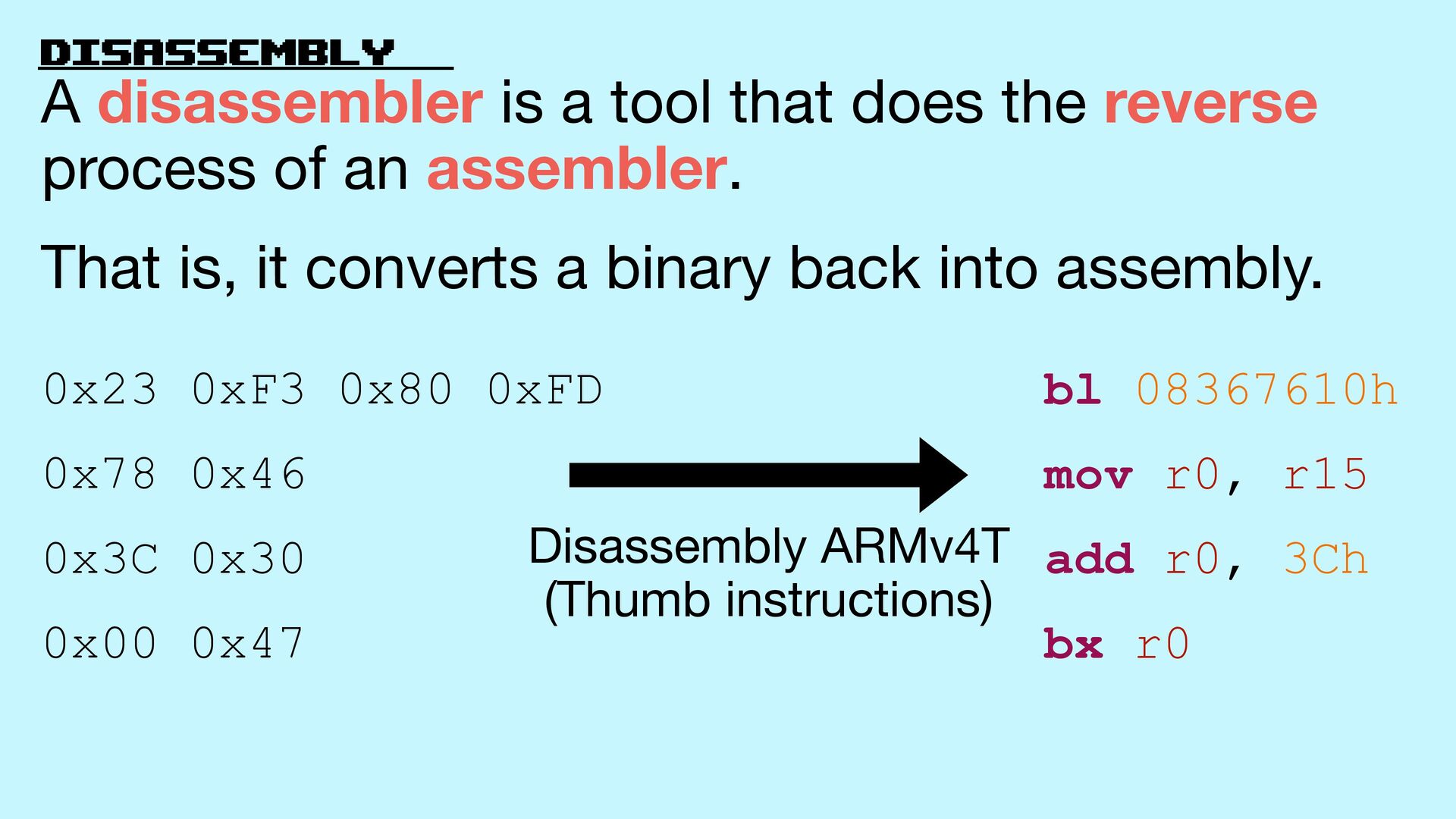 (Thumb instructions) A disassembler is a tool that does the reverse process of an assembler. That is, it converts a binary back into assembly.