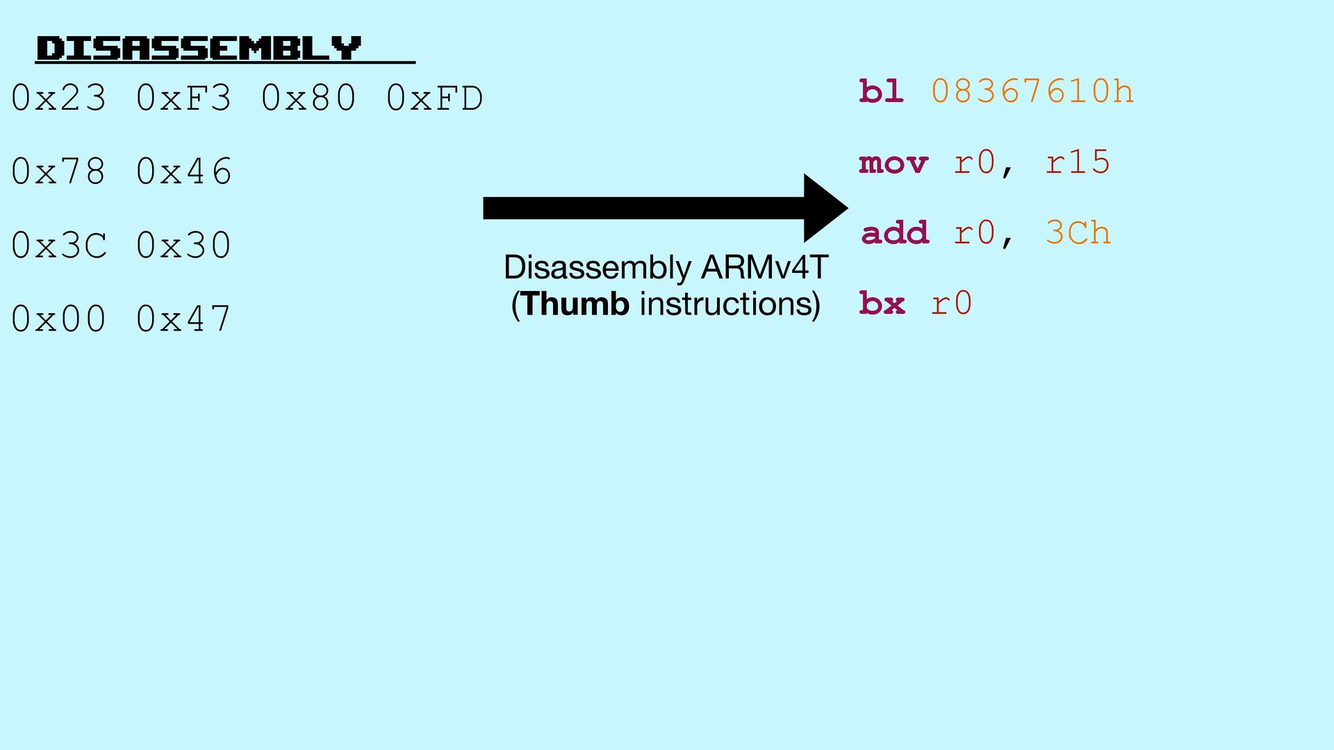 13. Disassembly 0x23 0xF3 0x80 0xFD 0x78 0x46 0x3C 0x30 0x00