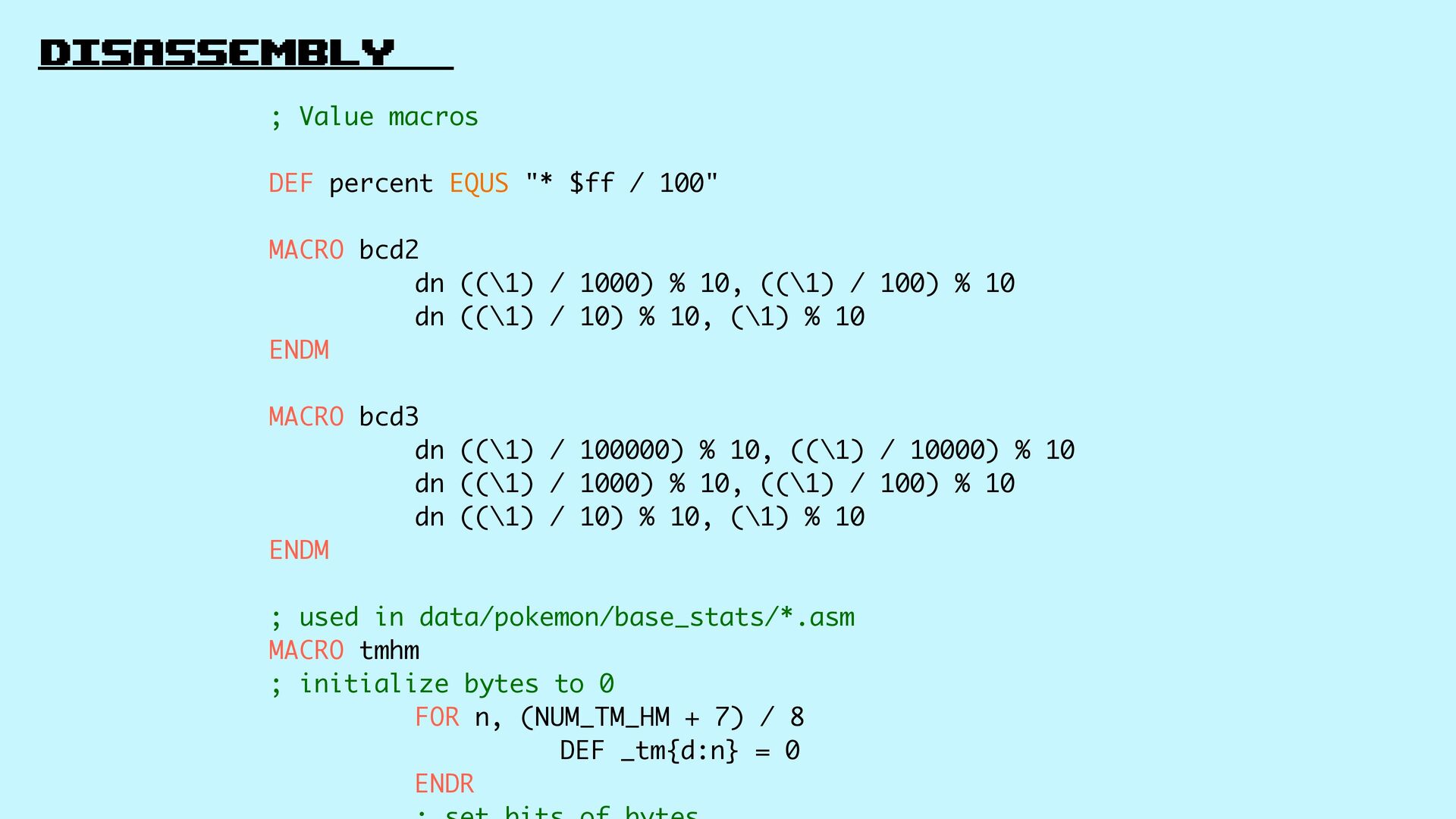 $ff / 100" MACRO bcd2 dn ((\1) / 1000) % 10, ((\1) / 100) % 10 dn ((\1) / 10) % 10, (\1) % 10 ENDM MACRO bcd3 dn ((\1) / 100000) % 10, ((\1) / 10000) % 10 dn ((\1) / 1000) % 10, ((\1) / 100) % 10 dn ((\1) / 10) % 10, (\1) % 10 ENDM ; used in data/pokemon/base_stats/*.asm MACRO tmhm ; initialize bytes to 0 FOR n, (NUM_TM_HM + 7) / 8 DEF _tm{d:n} = 0 ENDR