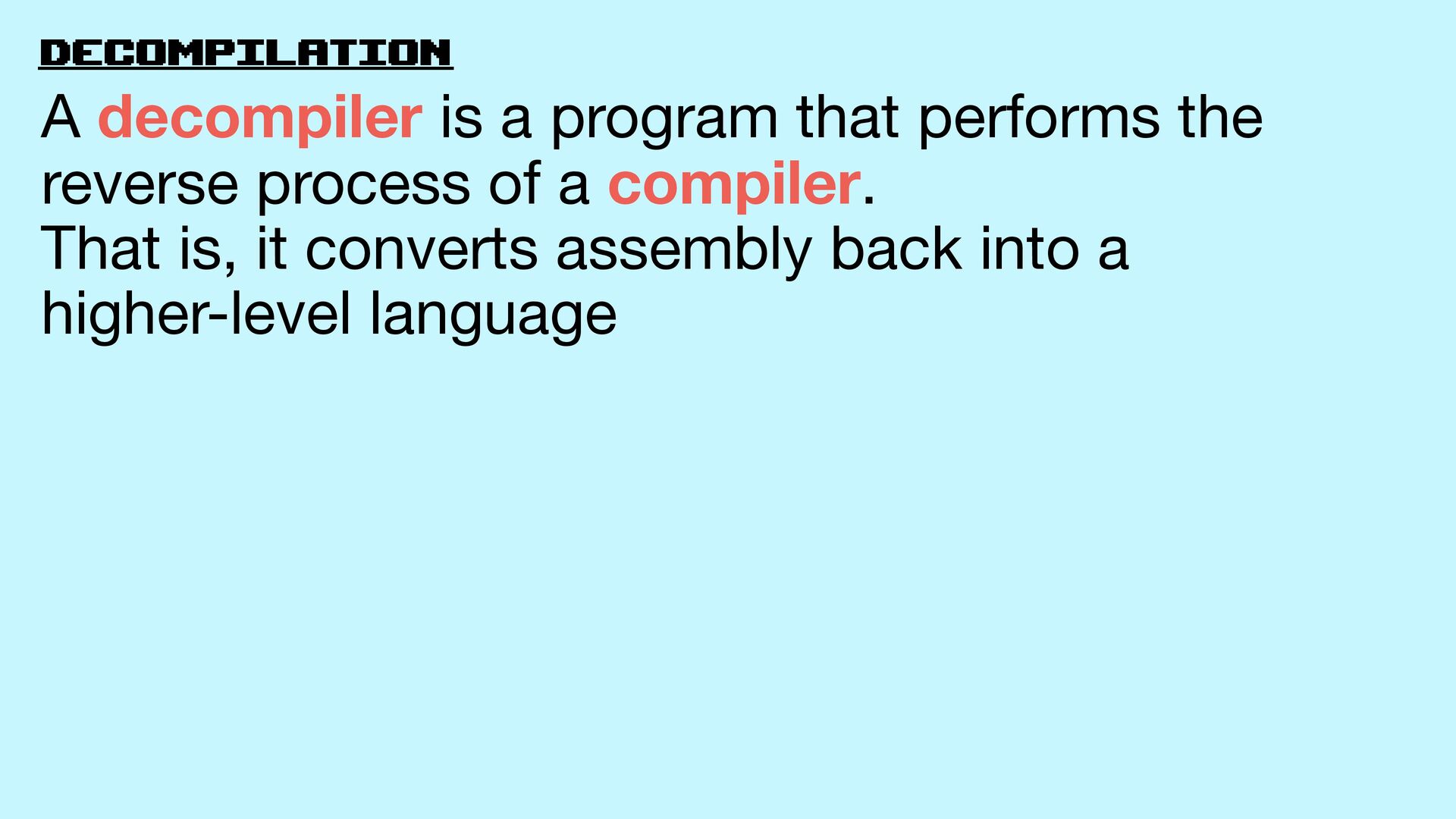 17. decompilation A decompiler is a program that performs the reverse