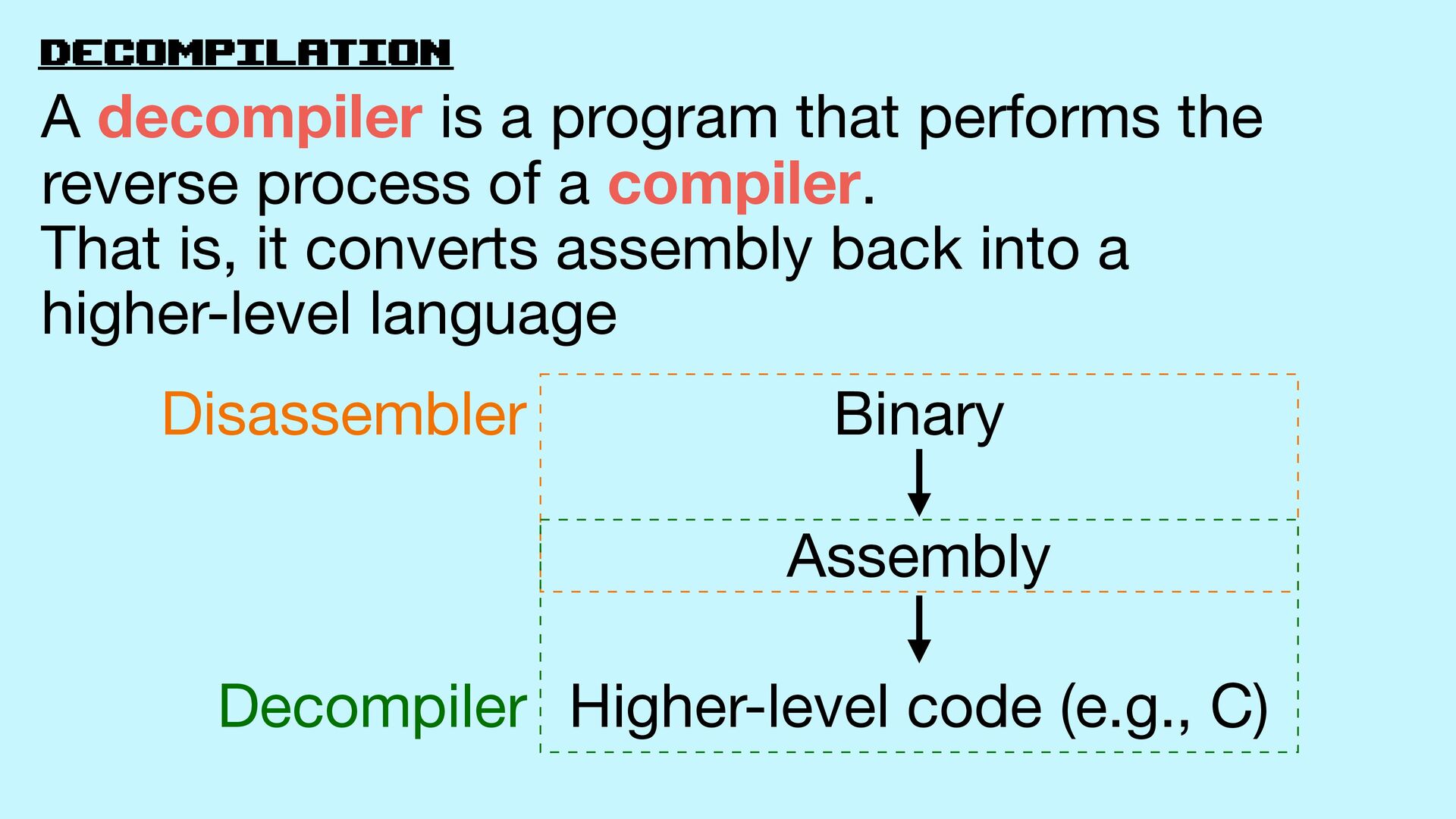 18. decompilation Binary Assembly Disassembler Higher-level code (e.g., C) Decompiler A