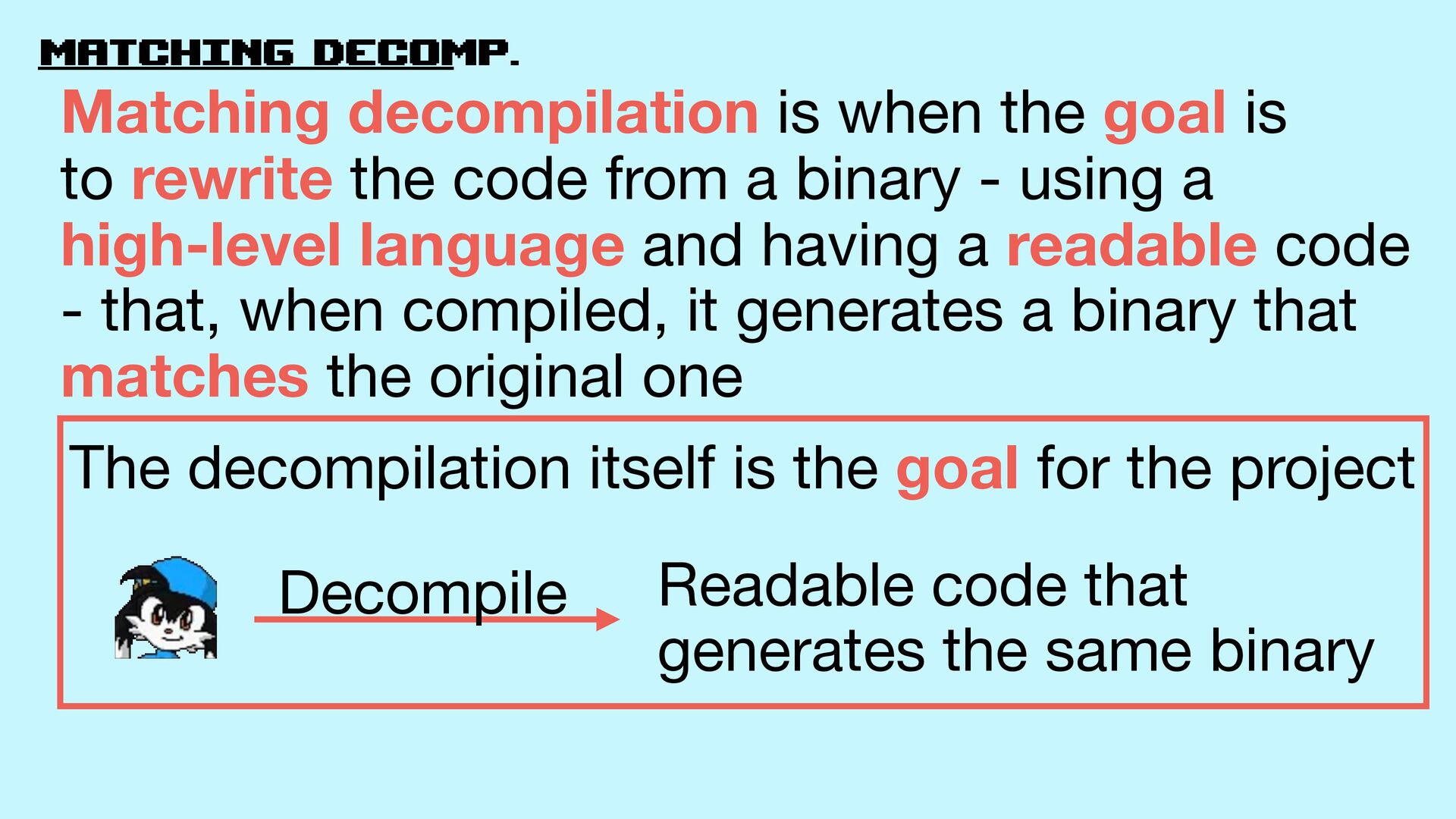 high-level language and having a readable code - that, when compiled, it generates a binary that matches the original one Decompile Readable code that generates the same binary The decompilation itself is the goal for the project