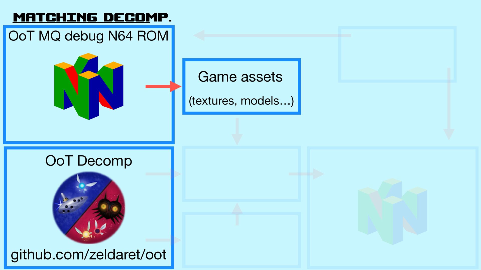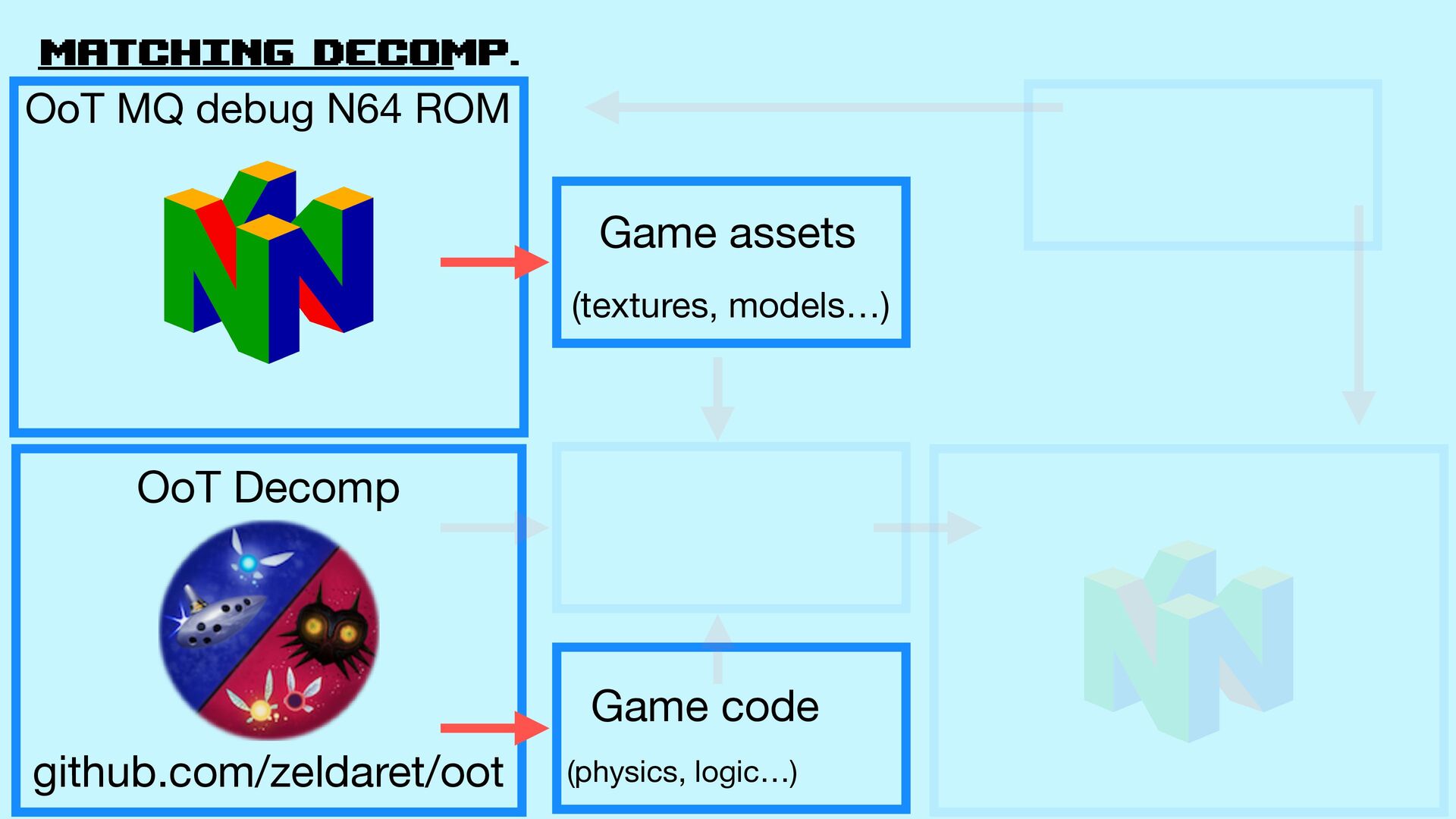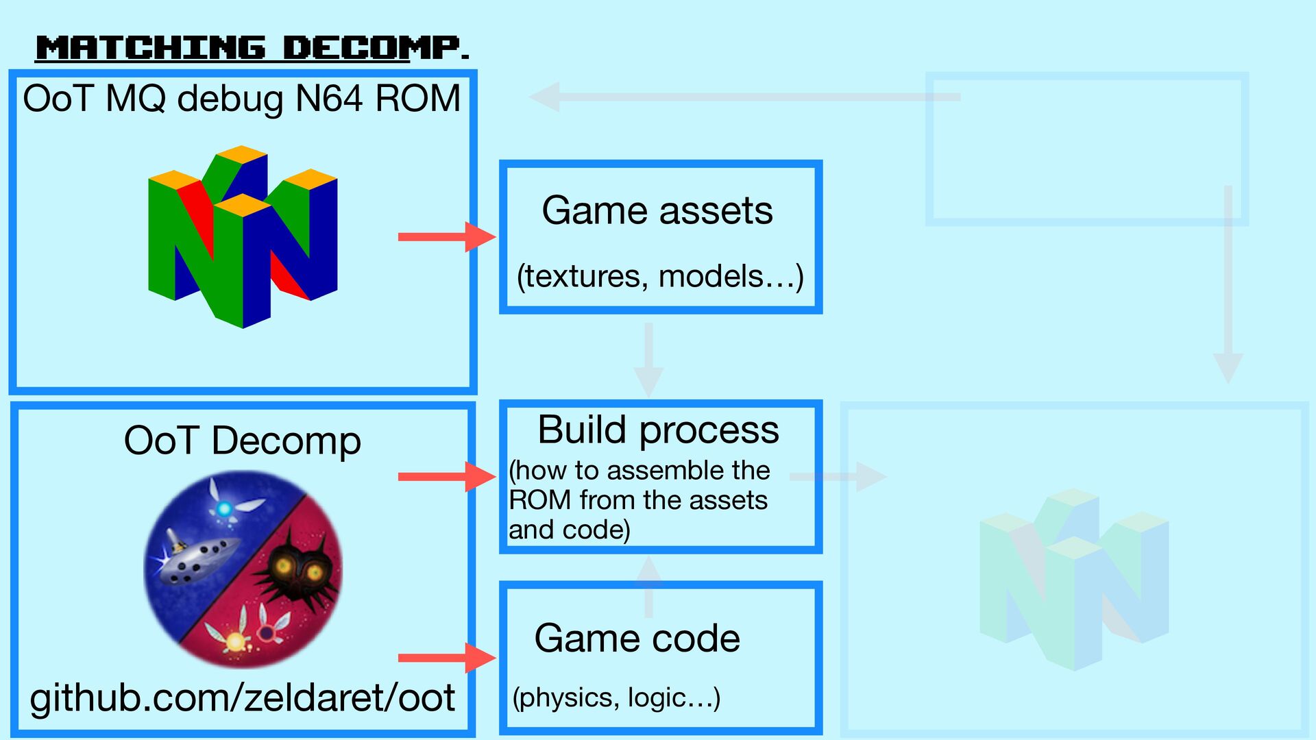 Decomp github.com/zeldaret/oot Game assets (texturas, models…) Build process (how to assemble the ROM from the assets and code) Game code (physics, logic…) Match OoT MQ debug N64 rom .z65 fi