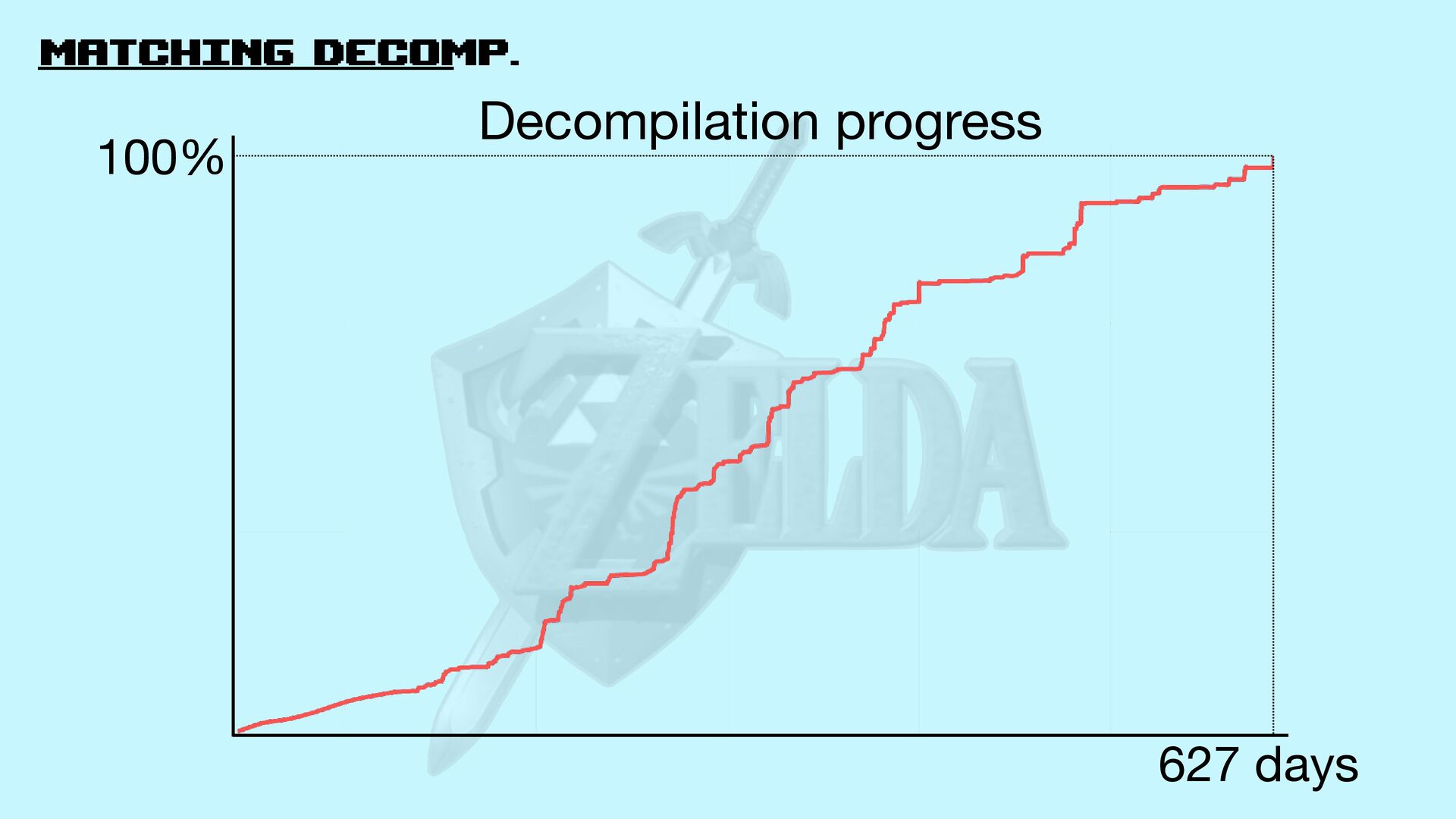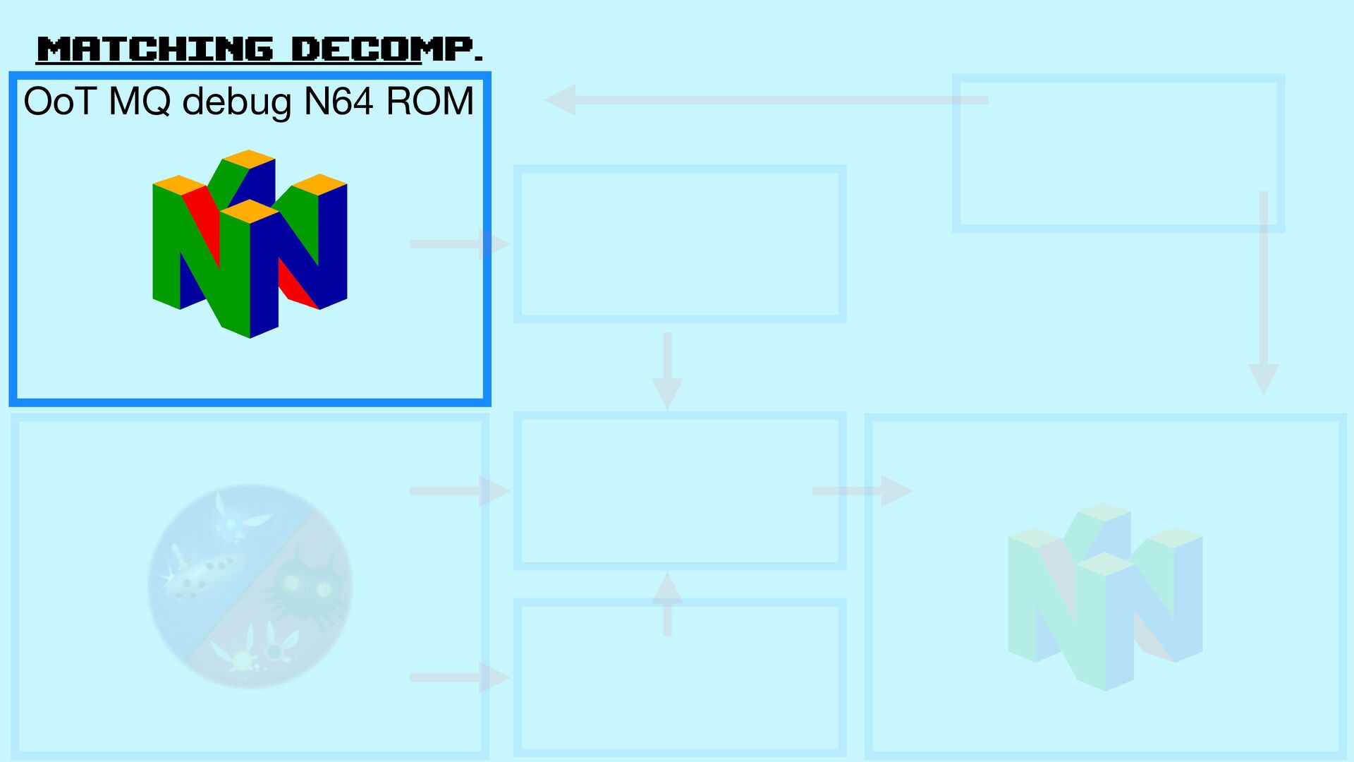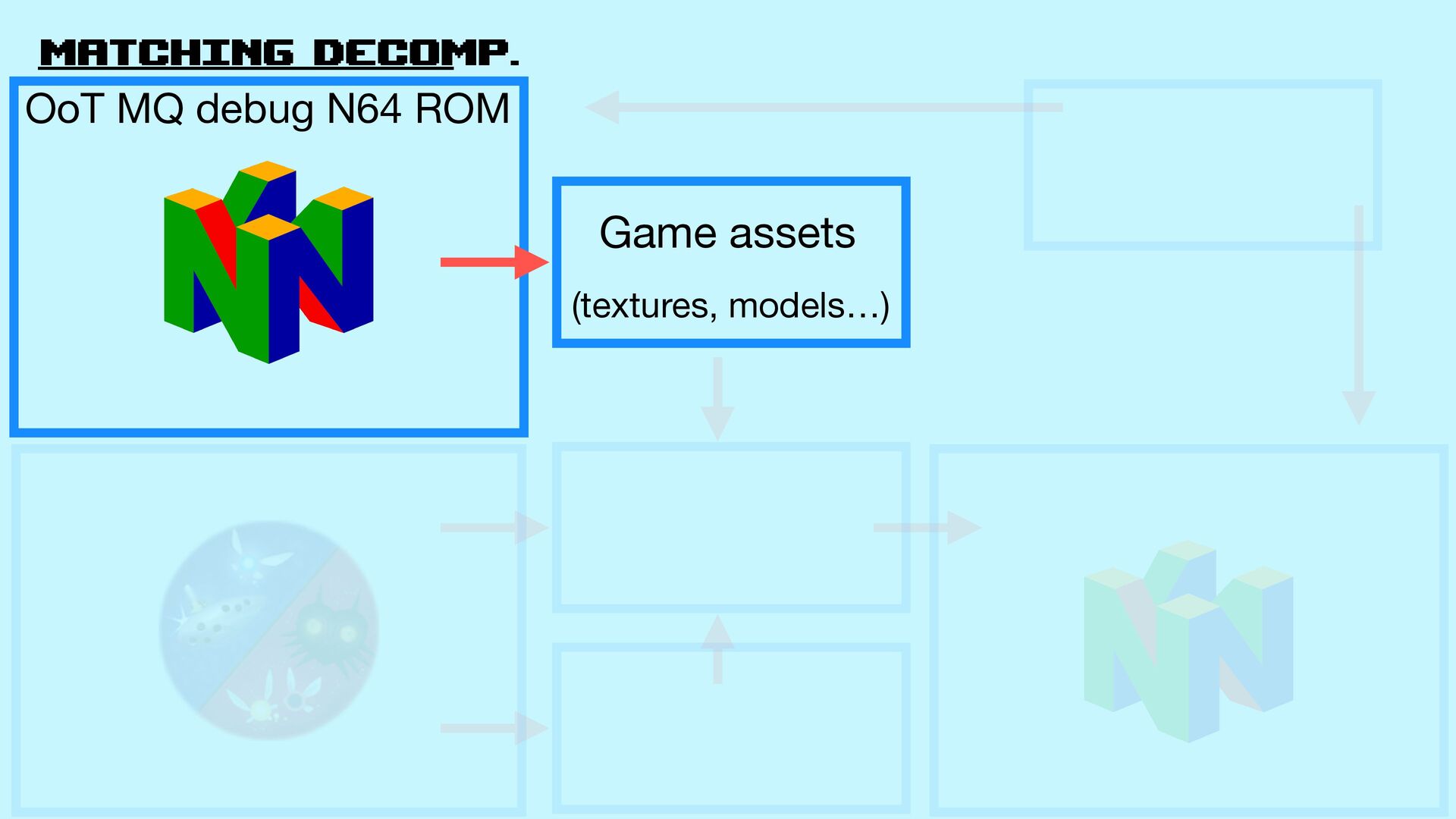 Decomp github.com/zeldaret/oot Game assets (texturas, models…) Build process (how to assemble the ROM from the assets and code) Game code (physics, logic…) Match OoT MQ debug N64 rom .z65 fi