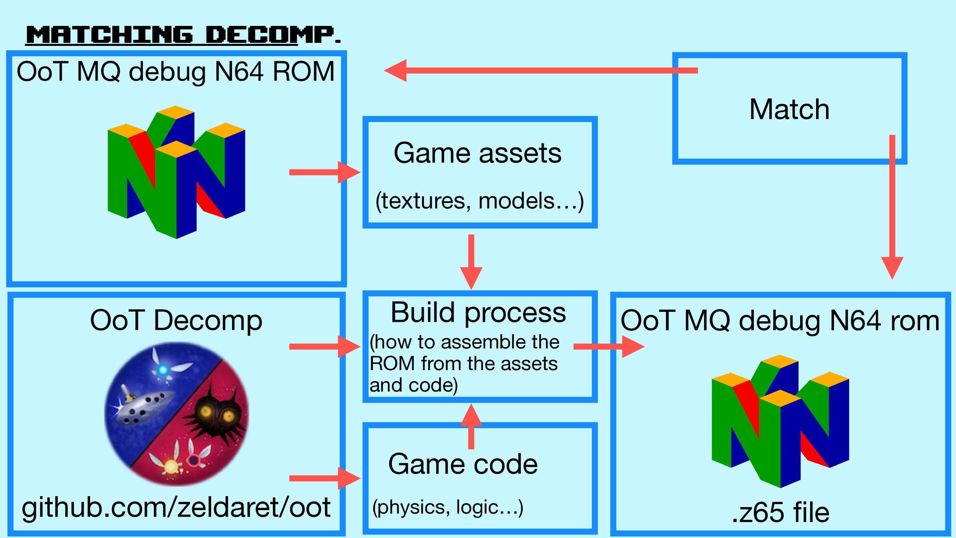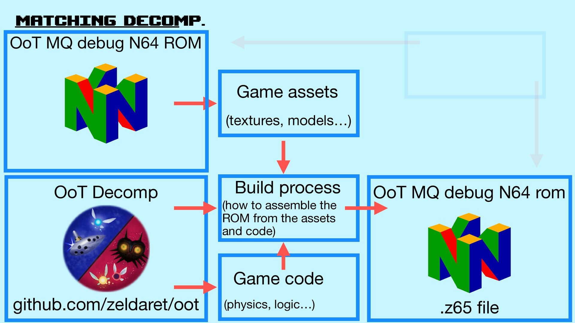 models…) Build process (how to assemble the ROM from the assets and code) Game code (physics, logic…) OoT MQ debug N64 rom .z65 fi le OoT MQ debug N64 ROM Match