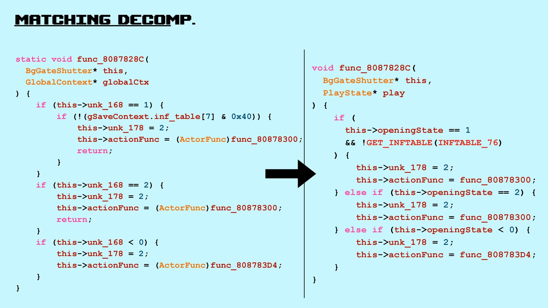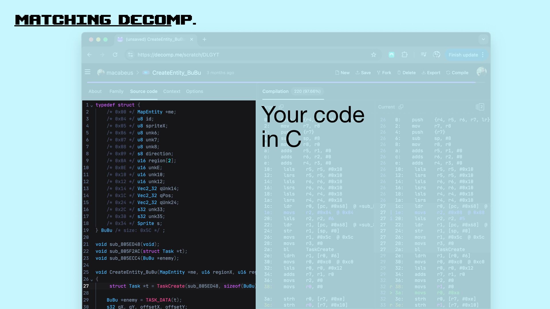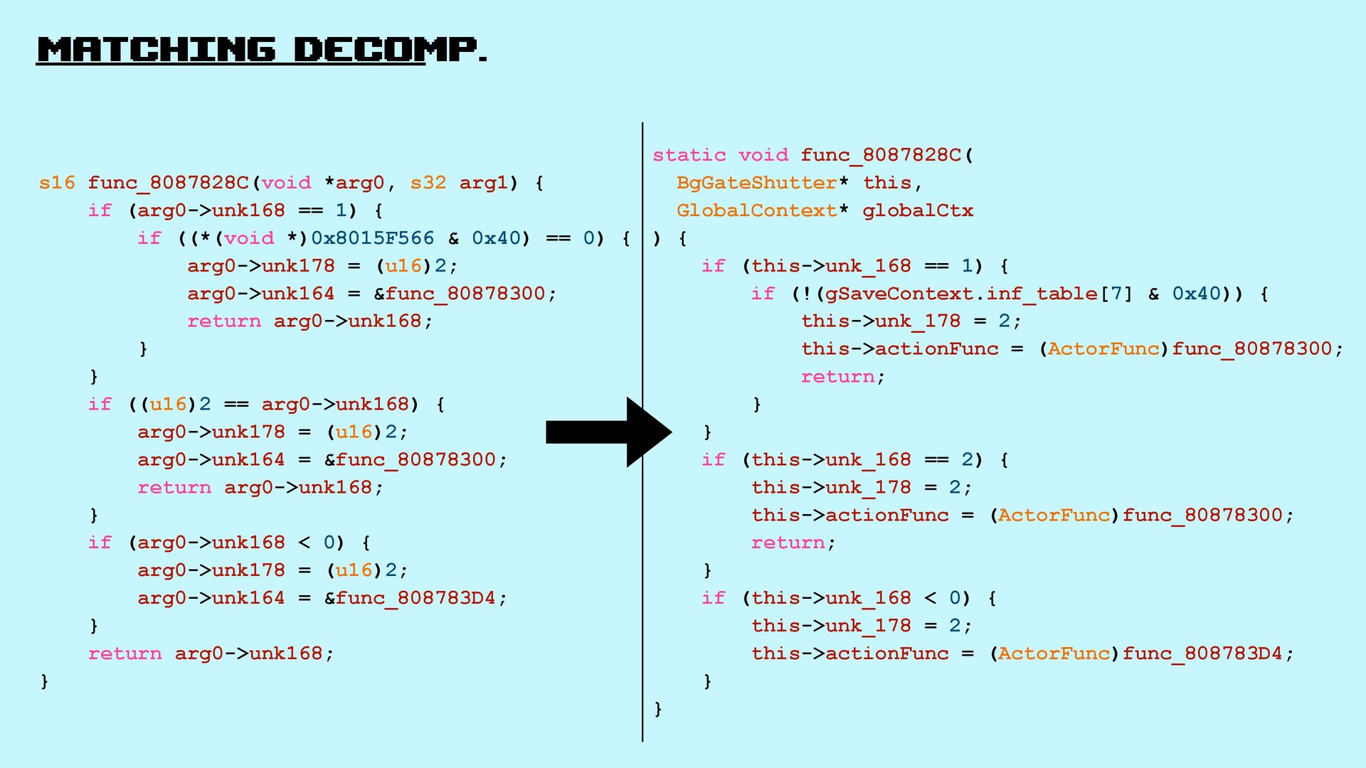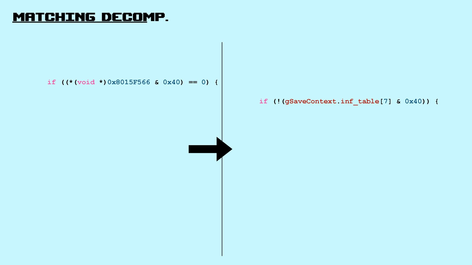 Let’s explore matching decompilation in games: the process of rewriting high-level code that, when compiled, produces a binary identical to the original one.
