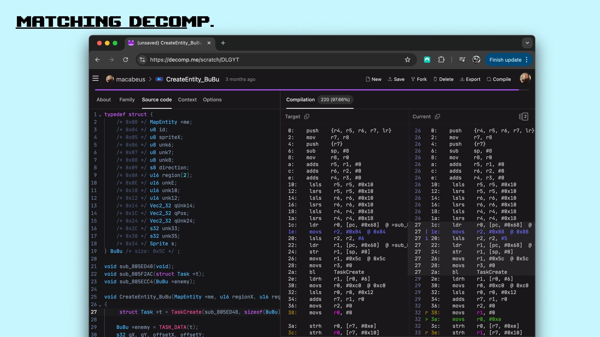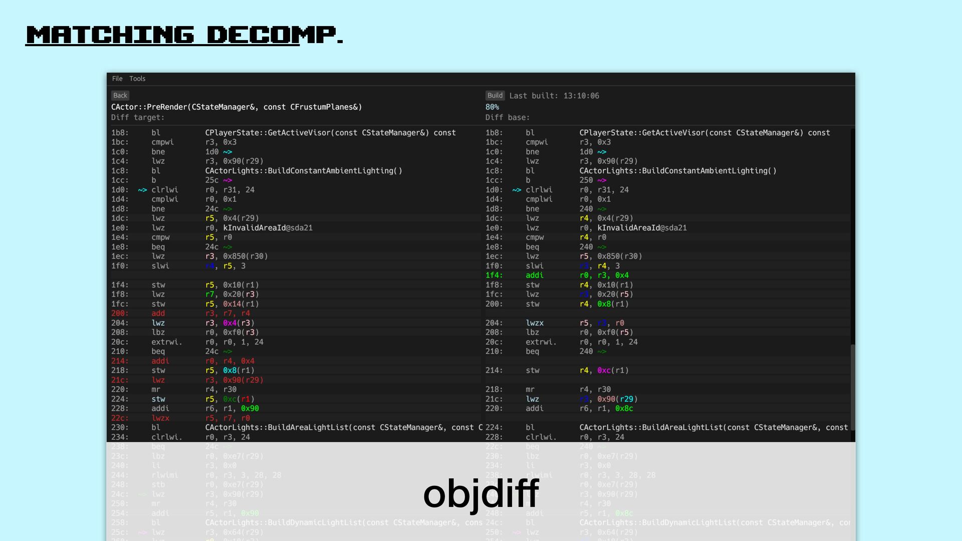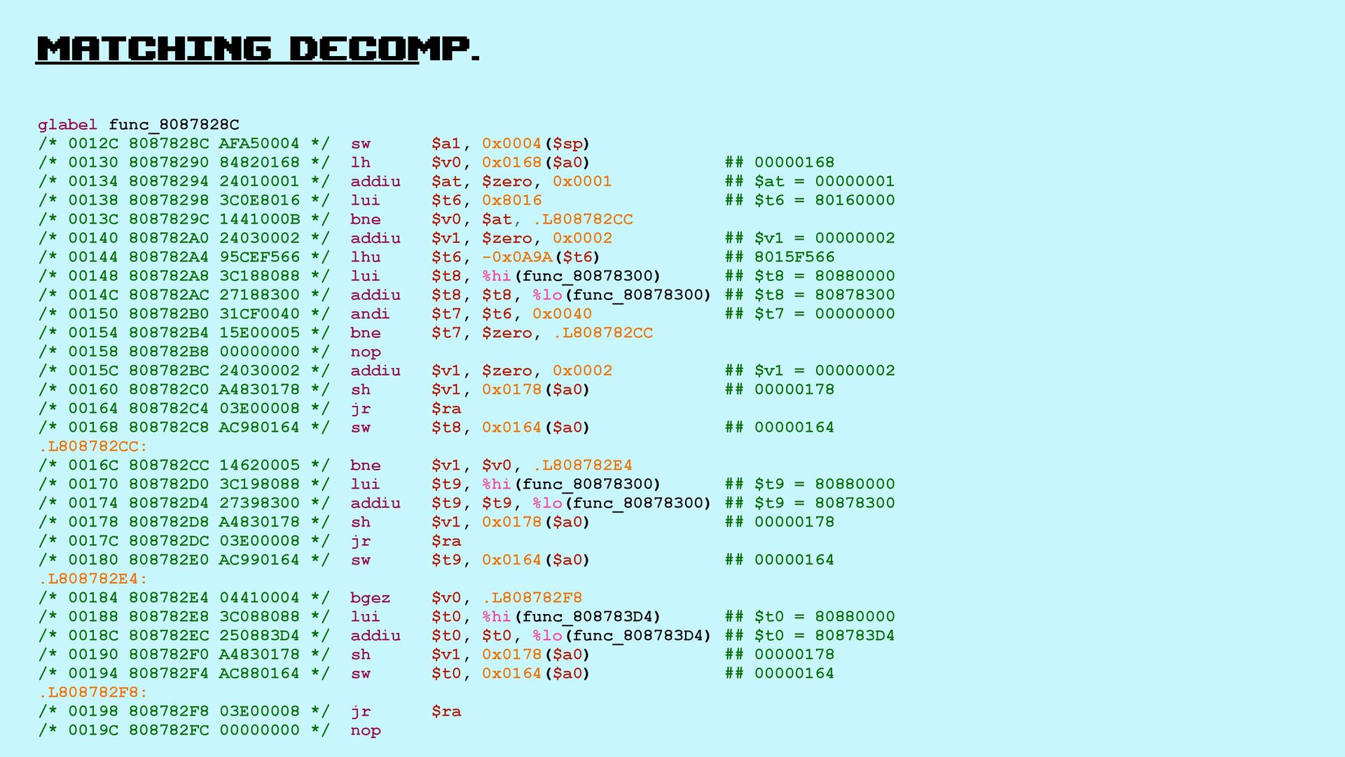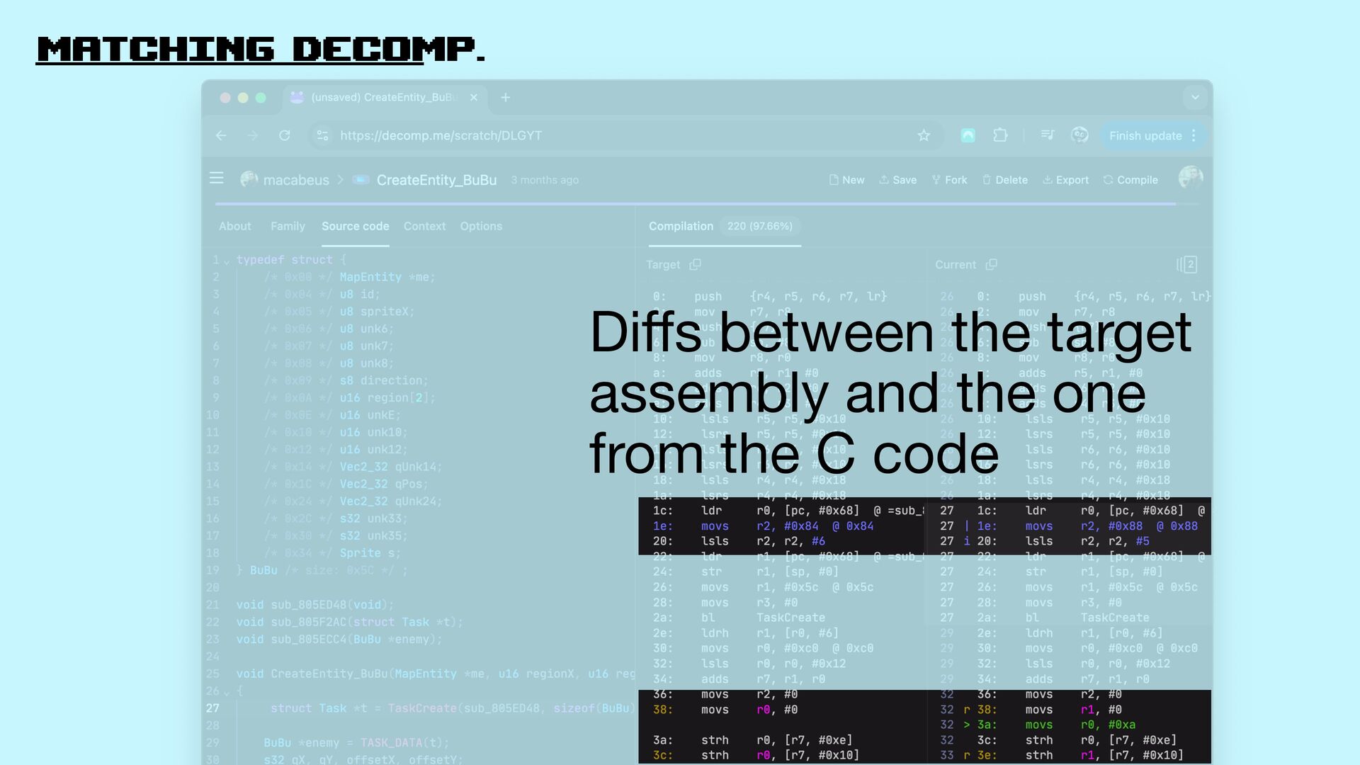 Let’s explore matching decompilation in games: the process of rewriting high-level code that, when compiled, produces a binary identical to the original one.