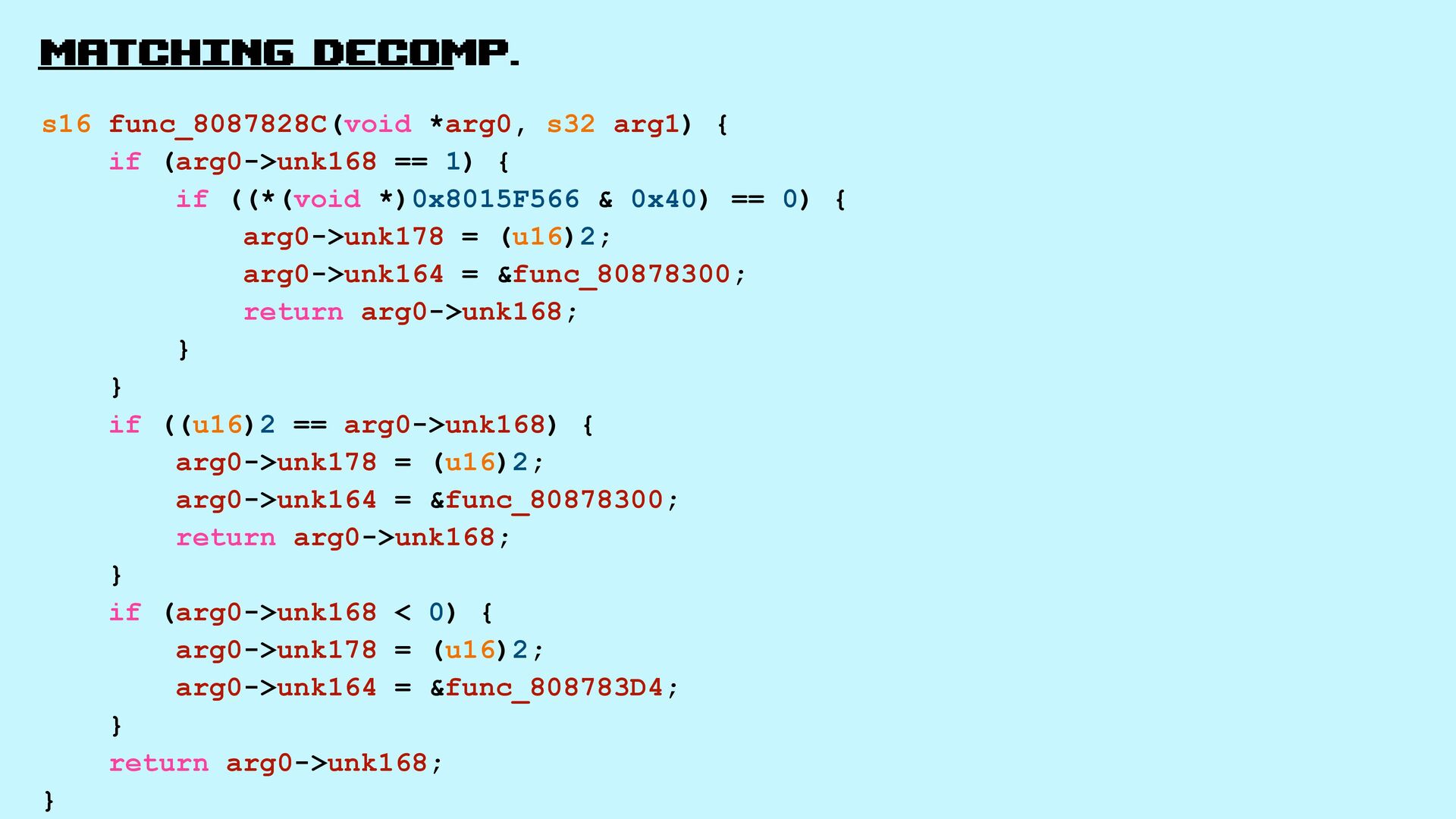 34. matching decomp. walkthrough s16 func_8087828C(void *arg0, s32 arg1) { if