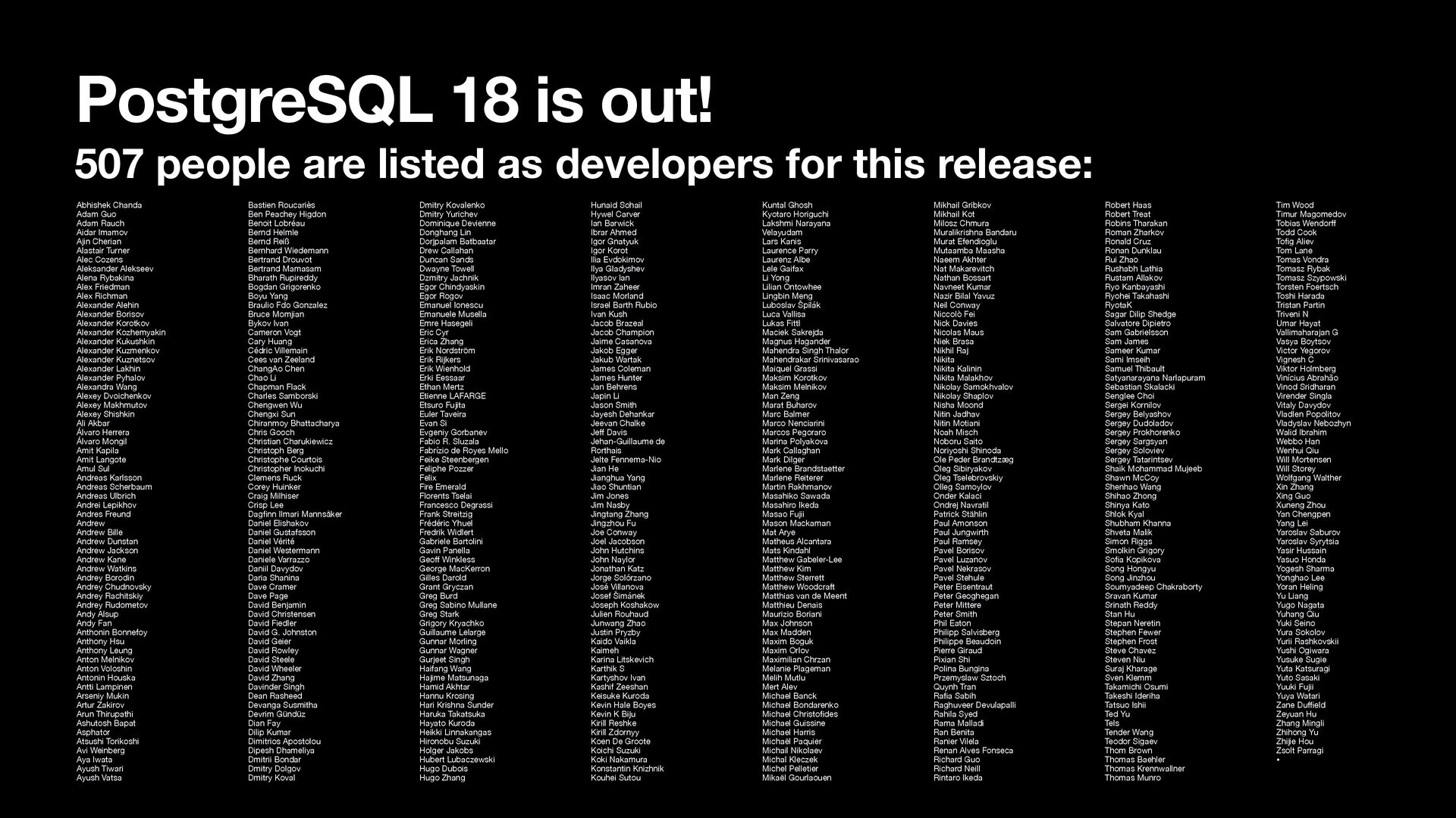 2. PostgreSQL 18 is out! 507 people are listed as developers