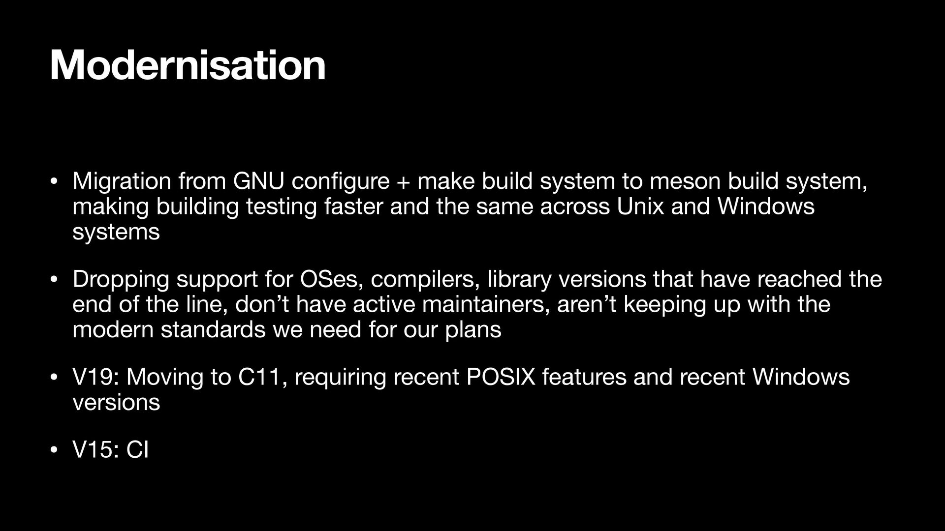 build system to meson build system, making building testing faster and the same across Unix and Windows systems • Dropping support for OSes, compilers, library versions that have reached the end of the line, don’t have active maintainers, aren’t keeping up with the modern standards we need for our plans • V19: Moving to C11, requiring recent POSIX features and recent Windows versions • V15: CI
