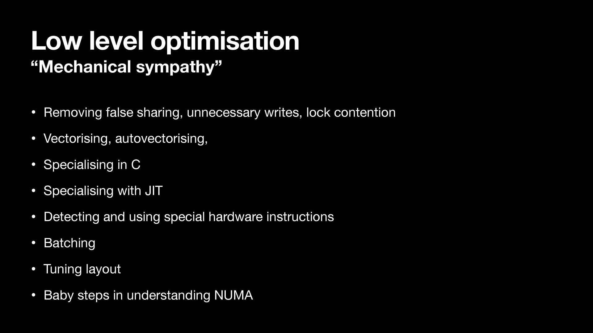 writes, lock contention • Vectorising, autovectorising, • Specialising in C • Specialising with JIT • Detecting and using special hardware instructions • Batching • Tuning layout • Baby steps in understanding NUMA
