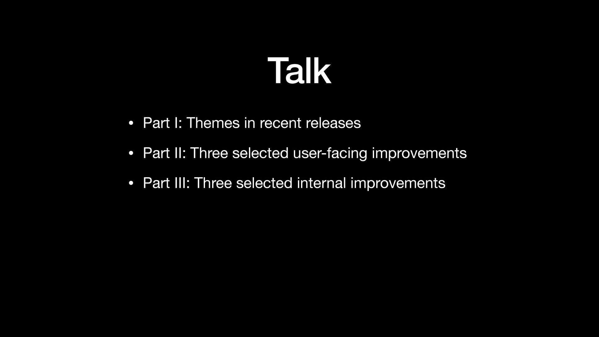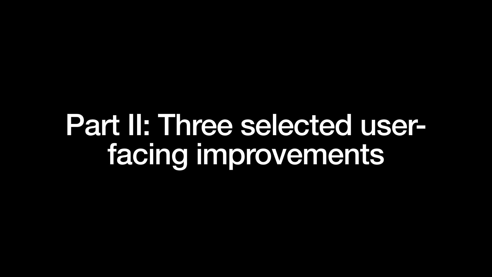 II: Three selected user-facing improvements • Part III: Three selected internal improvements