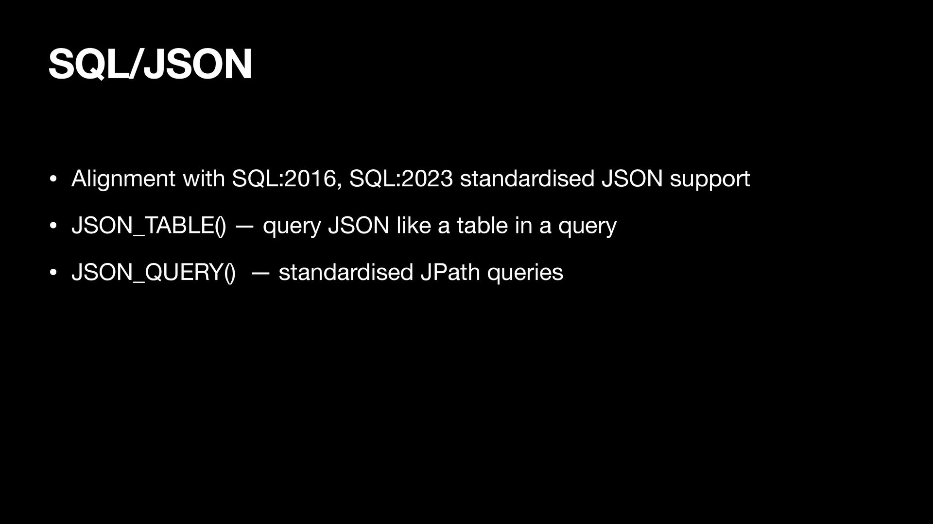 JSON_TABLE() — query JSON like a table in a query • JSON_QUERY() — standardised JPath queries