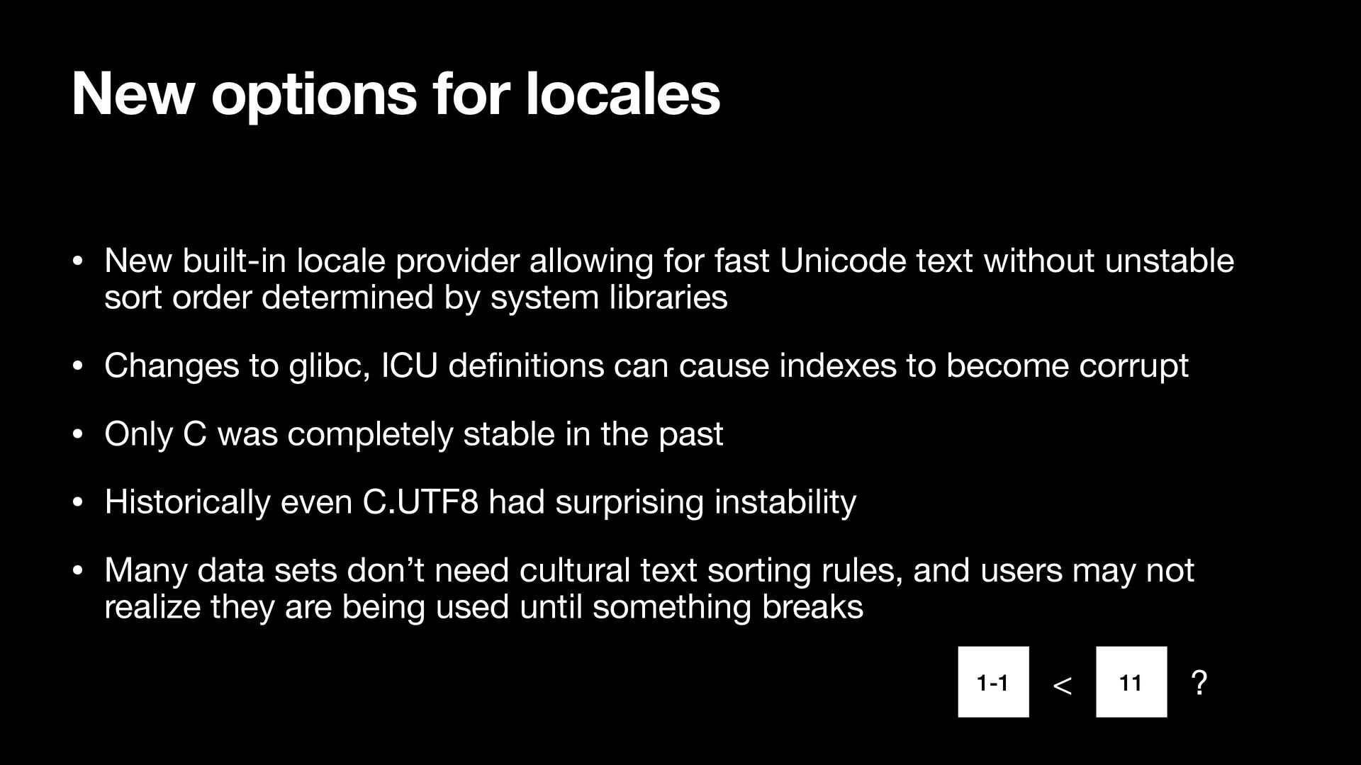 for fast Unicode text without unstable sort order determined by system libraries • Changes to glibc, ICU de fi nitions can cause indexes to become corrupt • Only C was completely stable in the past • Historically even C.UTF8 had surprising instability • Many data sets don’t need cultural text sorting rules, and users may not realize they are being used until something breaks 1-1 11 < ?