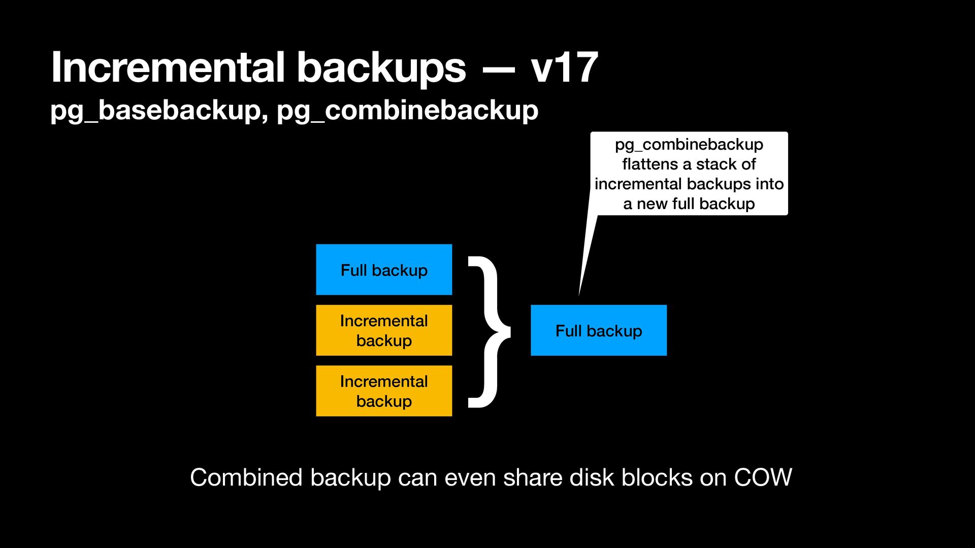 Incremental backup } Full backup pg_combinebackup fl attens a stack of incremental backups into a new full backup Combined backup can even share disk blocks on COW