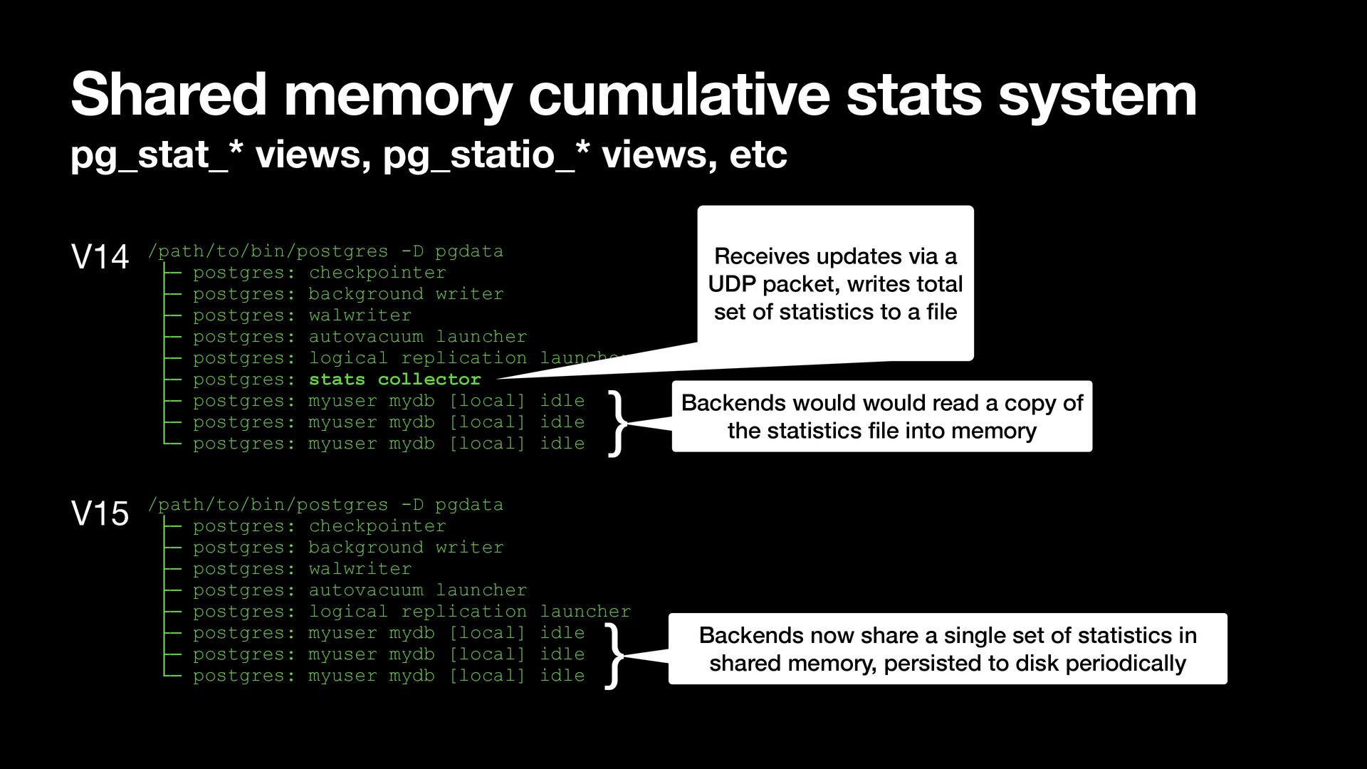 /path/to/bin/postgres -D pgdata ├─ postgres: checkpointer ├─ postgres: background writer ├─ postgres: walwriter ├─ postgres: autovacuum launcher ├─ postgres: logical replication launcher ├─ postgres: stats collector ├─ postgres: myuser mydb [local] idle ├─ postgres: myuser mydb [local] idle └─ postgres: myuser mydb [local] idle Receives updates via a UDP packet, writes total set of statistics to a fi le /path/to/bin/postgres -D pgdata ├─ postgres: checkpointer ├─ postgres: background writer ├─ postgres: walwriter ├─ postgres: autovacuum launcher ├─ postgres: logical replication launcher ├─ postgres: myuser mydb [local] idle ├─ postgres: myuser mydb [local] idle └─ postgres: myuser mydb [local] idle } Backends would would read a copy of the statistics fi le into memory } Backends now share a single set of statistics in shared memory, persisted to disk periodically V14 V15