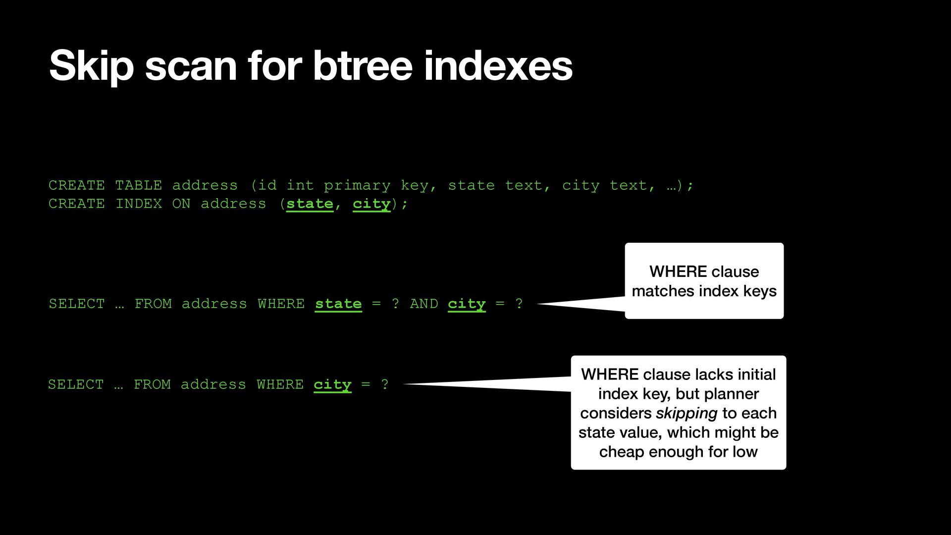 primary key, state text, city text, …); CREATE INDEX ON address (state, city); SELECT … FROM address WHERE state = ? AND city = ? SELECT … FROM address WHERE city = ? WHERE clause matches index keys WHERE clause lacks initial index key, but planner considers skipping to each state value, which might be cheap enough for low