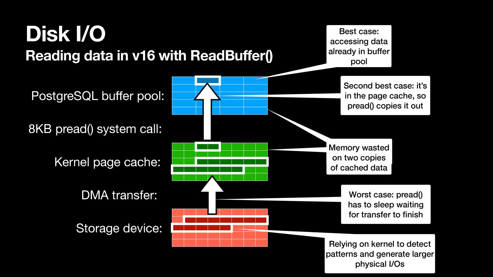 8KB pread() system call: PostgreSQL bu ff er pool: Kernel page cache: Storage device: DMA transfer: Memory wasted on two copies of cached data Best case: accessing data already in buffer pool Second best case: it’s in the page cache, so pread() copies it out Worst case: pread() has to sleep waiting for transfer to fi nish Relying on kernel to detect patterns and generate larger physical I/Os