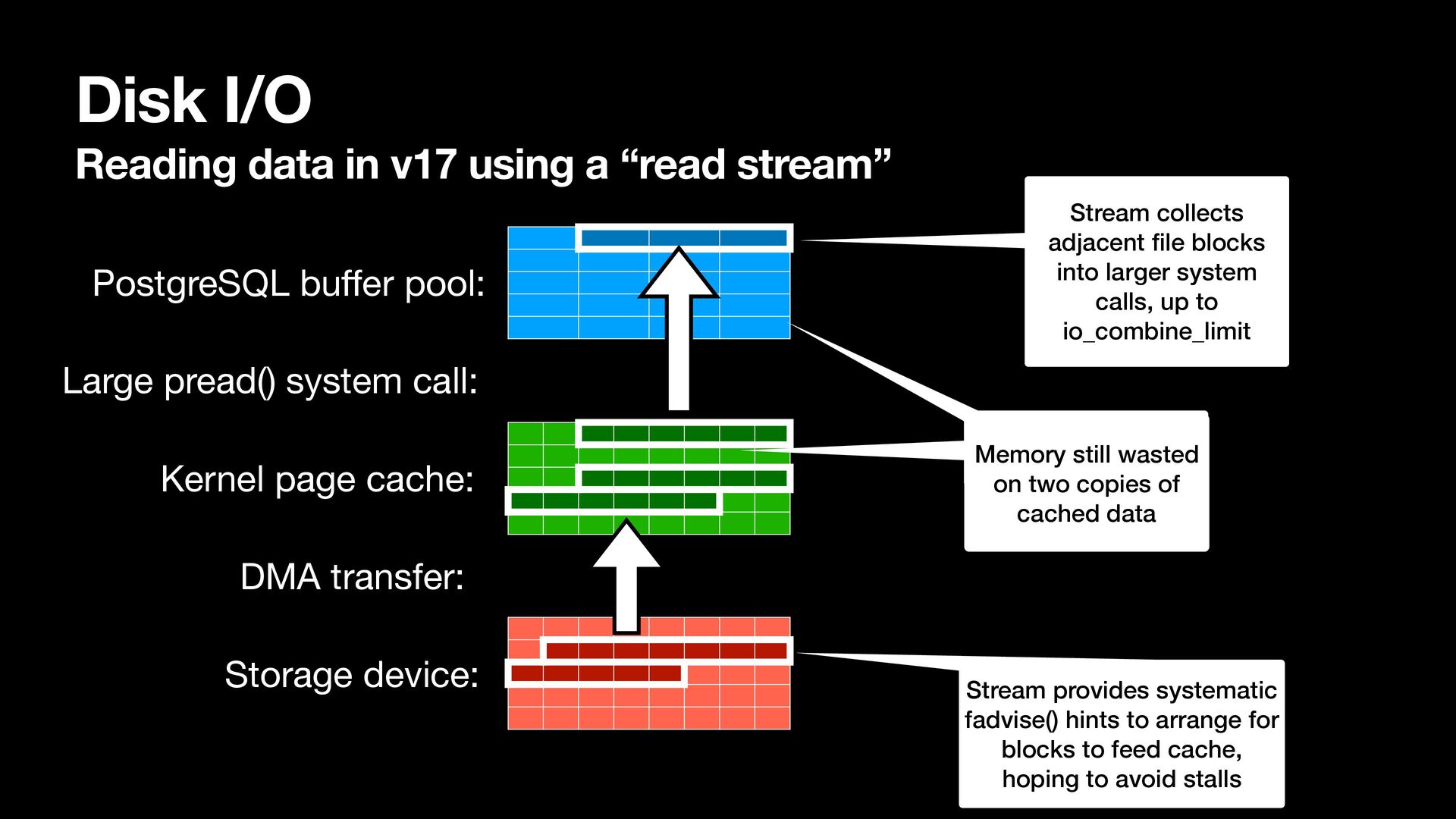 Large pread() system call: PostgreSQL bu ff er pool: Kernel page cache: Storage device: DMA transfer: Memory still wasted on two copies of cached data Stream collects adjacent fi le blocks into larger system calls, up to io_combine_limit Stream provides systematic fadvise() hints to arrange for blocks to feed cache, hoping to avoid stalls