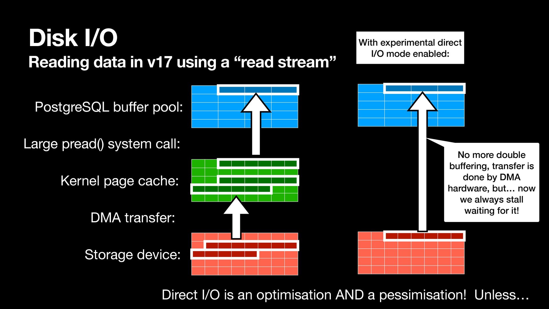 Large pread() system call: PostgreSQL bu ff er pool: Kernel page cache: Storage device: DMA transfer: With experimental direct I/O mode enabled: No more double buffering, transfer is done by DMA hardware, but… now we always stall waiting for it! Direct I/O is an optimisation AND a pessimisation! Unless…