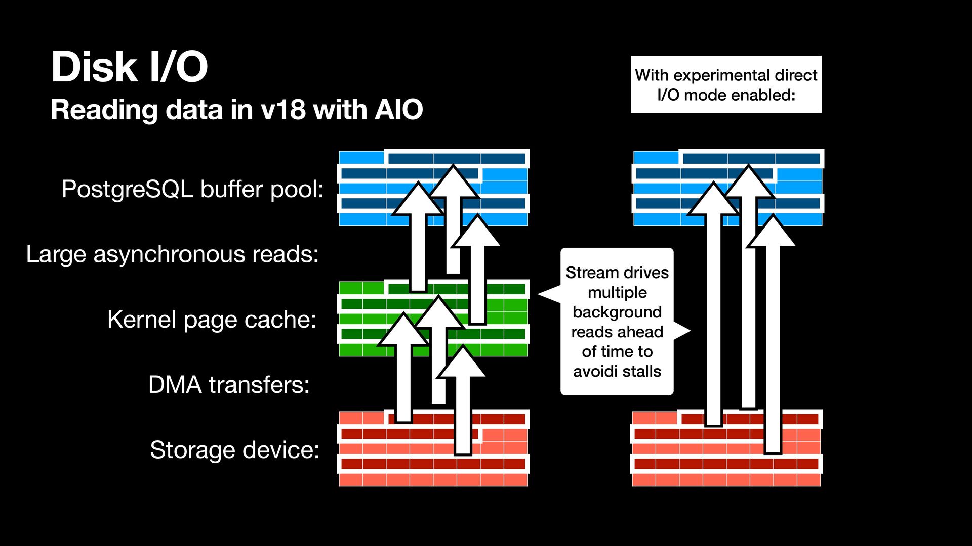 reads: PostgreSQL bu ff er pool: Kernel page cache: Storage device: DMA transfers: With experimental direct I/O mode enabled: Stream drives N background reads ahead of time, avoiding stalls ahead of time Stream drives multiple background reads ahead of time to avoidi stalls