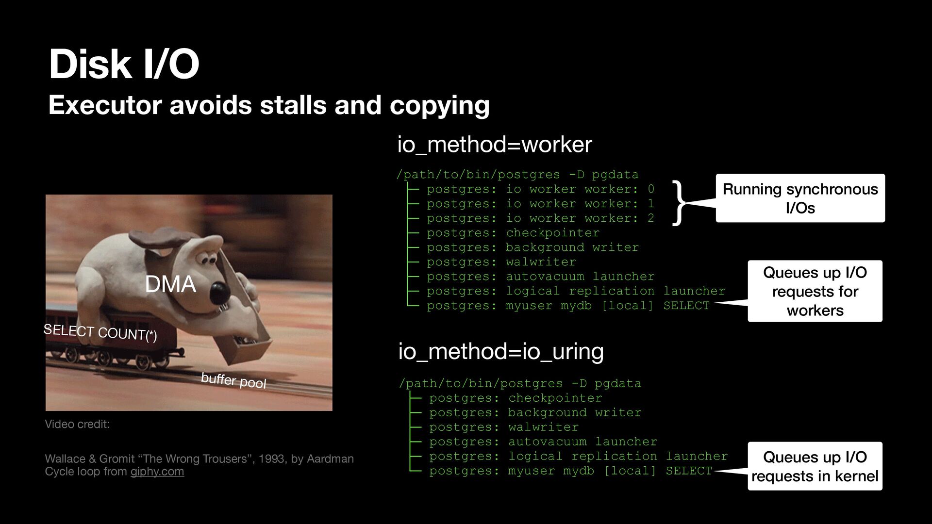 Cycle loop from giphy.com /path/to/bin/postgres -D pgdata ├─ postgres: io worker worker: 0 ├─ postgres: io worker worker: 1 ├─ postgres: io worker worker: 2 ├─ postgres: checkpointer ├─ postgres: background writer ├─ postgres: walwriter ├─ postgres: autovacuum launcher ├─ postgres: logical replication launcher └─ postgres: myuser mydb [local] SELECT io_method=worker io_method=io_uring /path/to/bin/postgres -D pgdata ├─ postgres: checkpointer ├─ postgres: background writer ├─ postgres: walwriter ├─ postgres: autovacuum launcher ├─ postgres: logical replication launcher └─ postgres: myuser mydb [local] SELECT } Running synchronous I/Os Queues up I/O requests for workers Queues up I/O requests in kernel