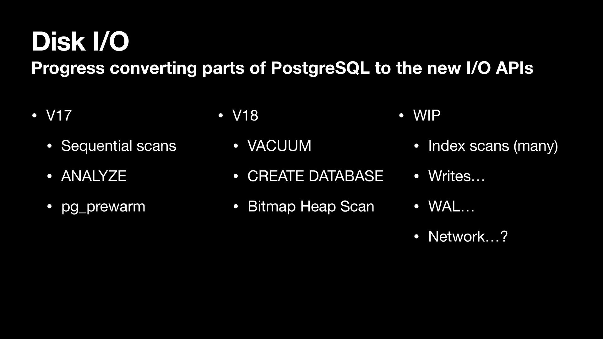 I/O APIs • V17 • Sequential scans • ANALYZE • pg_prewarm • V18 • VACUUM • CREATE DATABASE • Bitmap Heap Scan • WIP • Index scans (many) • Writes… • WAL… • Network…?
