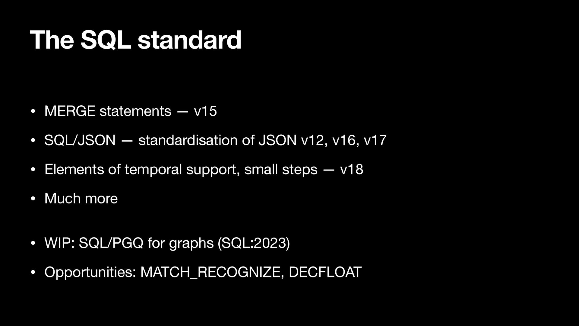 • WIP: SQL/PGQ for graphs (SQL:2023) • Opportunities: MATCH_RECOGNIZE, DECFLOAT