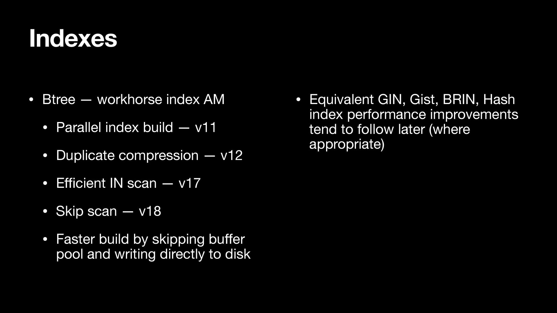 build — v11 • Duplicate compression — v12 • E ffi cient IN scan — v17 • Skip scan — v18 • Faster build by skipping bu ff er pool and writing directly to disk • Equivalent GIN, Gist, BRIN, Hash index performance improvements tend to follow later (where appropriate)