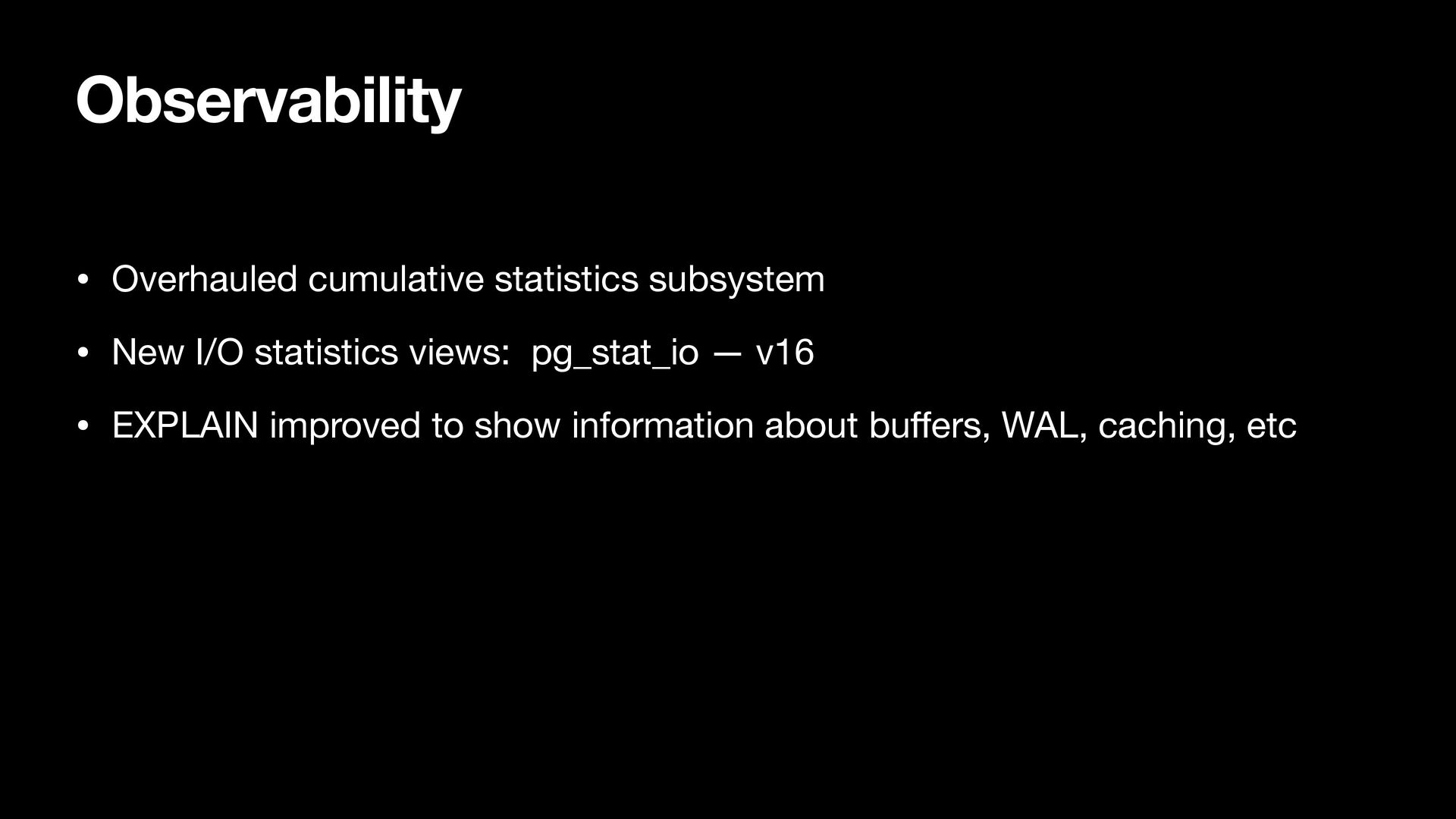 views: pg_stat_io — v16 • EXPLAIN improved to show information about bu ff ers, WAL, caching, etc
