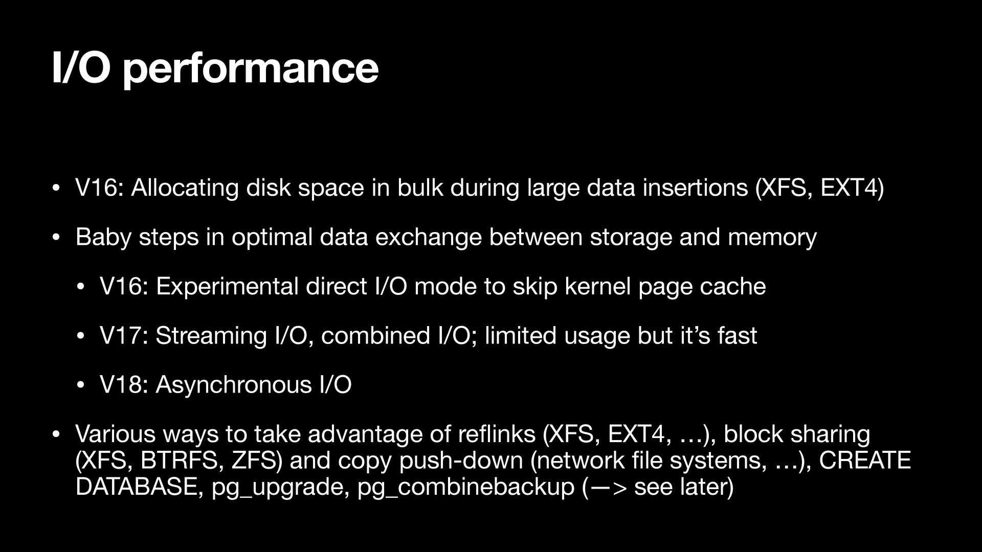 large data insertions (XFS, EXT4) • Baby steps in optimal data exchange between storage and memory • V16: Experimental direct I/O mode to skip kernel page cache • V17: Streaming I/O, combined I/O; limited usage but it’s fast • V18: Asynchronous I/O • Various ways to take advantage of re fl inks (XFS, EXT4, …), block sharing (XFS, BTRFS, ZFS) and copy push-down (network fi le systems, …), CREATE DATABASE, pg_upgrade, pg_combinebackup (—> see later)