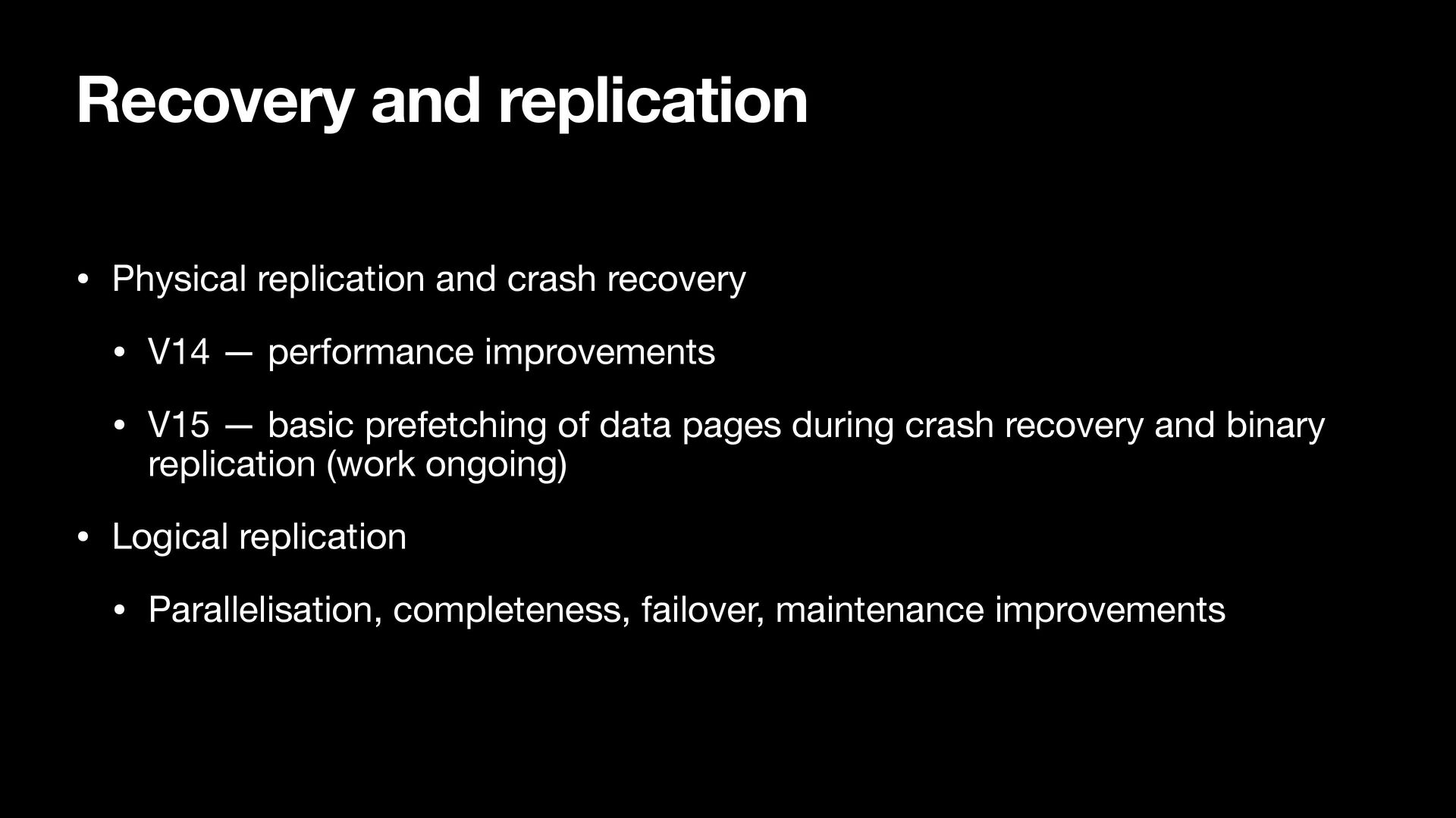V14 — performance improvements • V15 — basic prefetching of data pages during crash recovery and binary replication (work ongoing) • Logical replication • Parallelisation, completeness, failover, maintenance improvements