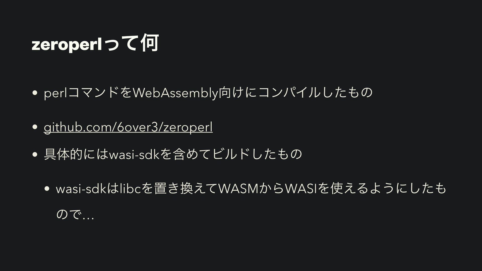 zeroperlͬͯԿ • perlίϚϯυΛWebAssembly͚ʹίϯύΠϧͨ͠ͷ • github.com/6over3/zeroperl • ۩ମతʹwasi-sdkΛؚΊͯϏϧυͨ͠ͷ • wasi-sdklibcΛஔ͖͑ͯWASM͔ΒWASIΛ͑ΔΑ͏ʹͨ͠ ͷͰ…