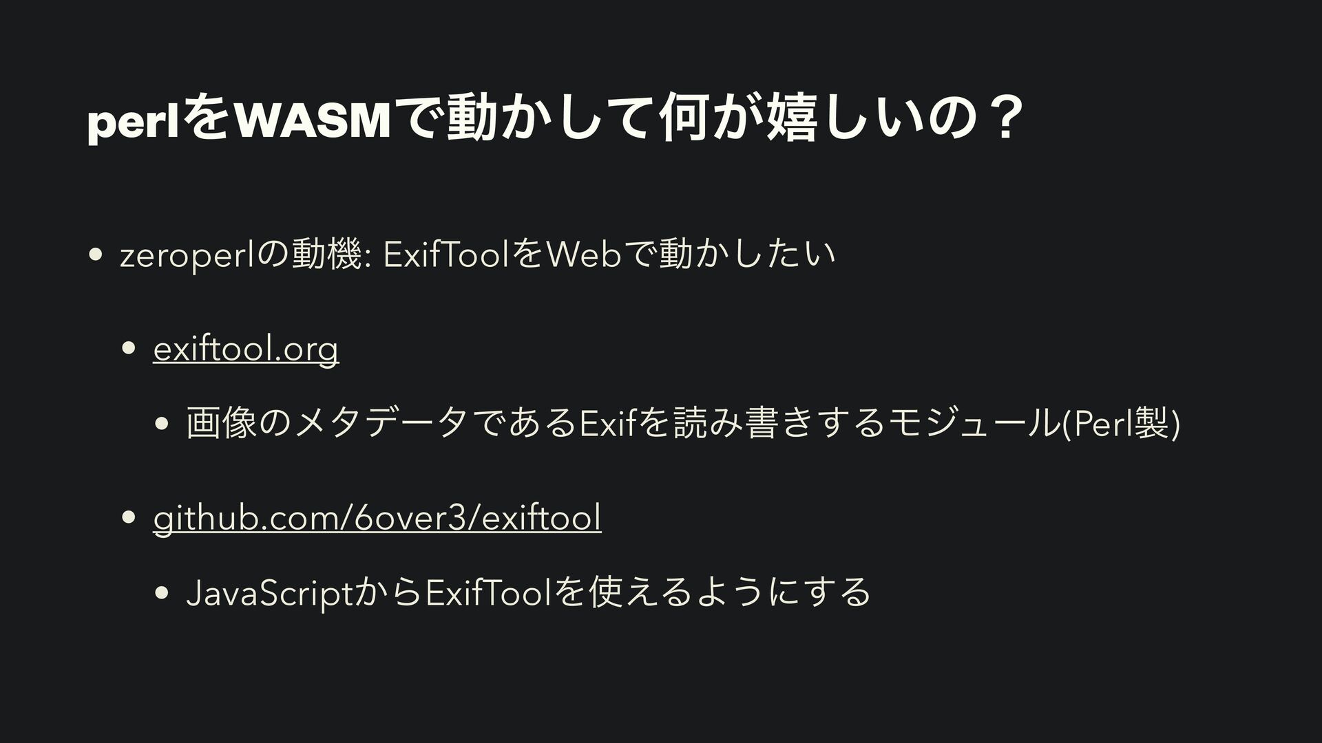 perlΛWASMͰಈ͔ͯ͠Կ͕خ͍͠ͷʁ • zeroperlͷಈػ: ExifToolΛWebͰಈ͔͍ͨ͠ • exiftool.org • ը૾ͷϝλσʔλͰ͋ΔExifΛಡΈॻ͖͢ΔϞδϡʔϧ(Perl) • github.com/6over3/exiftool