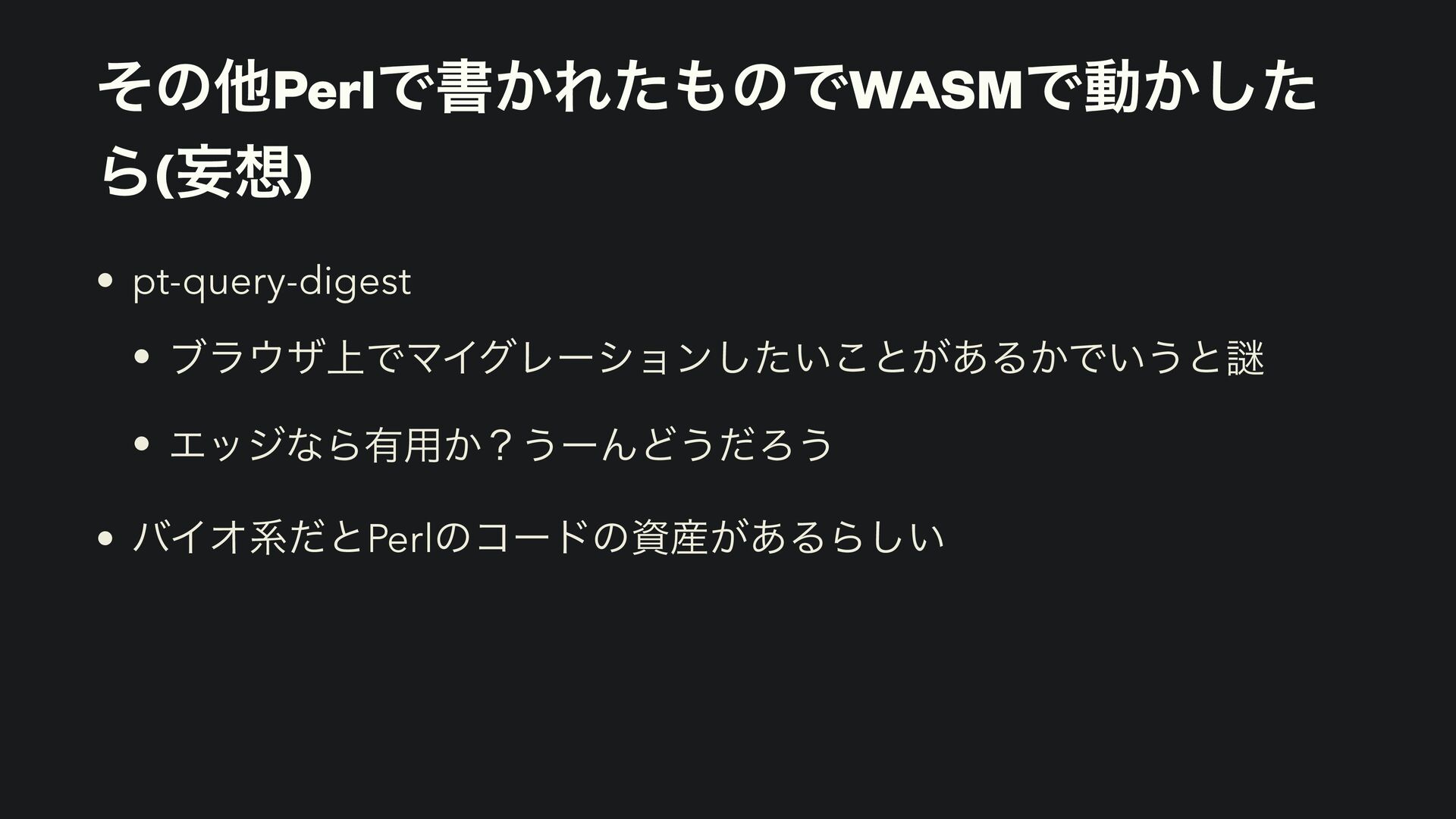 ͦͷଞPerlͰॻ͔ΕͨͷͰWASMͰಈ͔ͨ͠ Β(ໝ) • pt-query-digest • ϒϥβ্ͰϚΠάϨʔγϣϯ͍ͨ͜͠ͱ͕͋Δ͔Ͱ͍͏ͱṖ • ΤοδͳΒ༗༻͔ʁ͏ʔΜͲ͏ͩΖ͏ • όΠΦܥͩͱPerlͷίʔυͷࢿ࢈͕͋ΔΒ͍͠