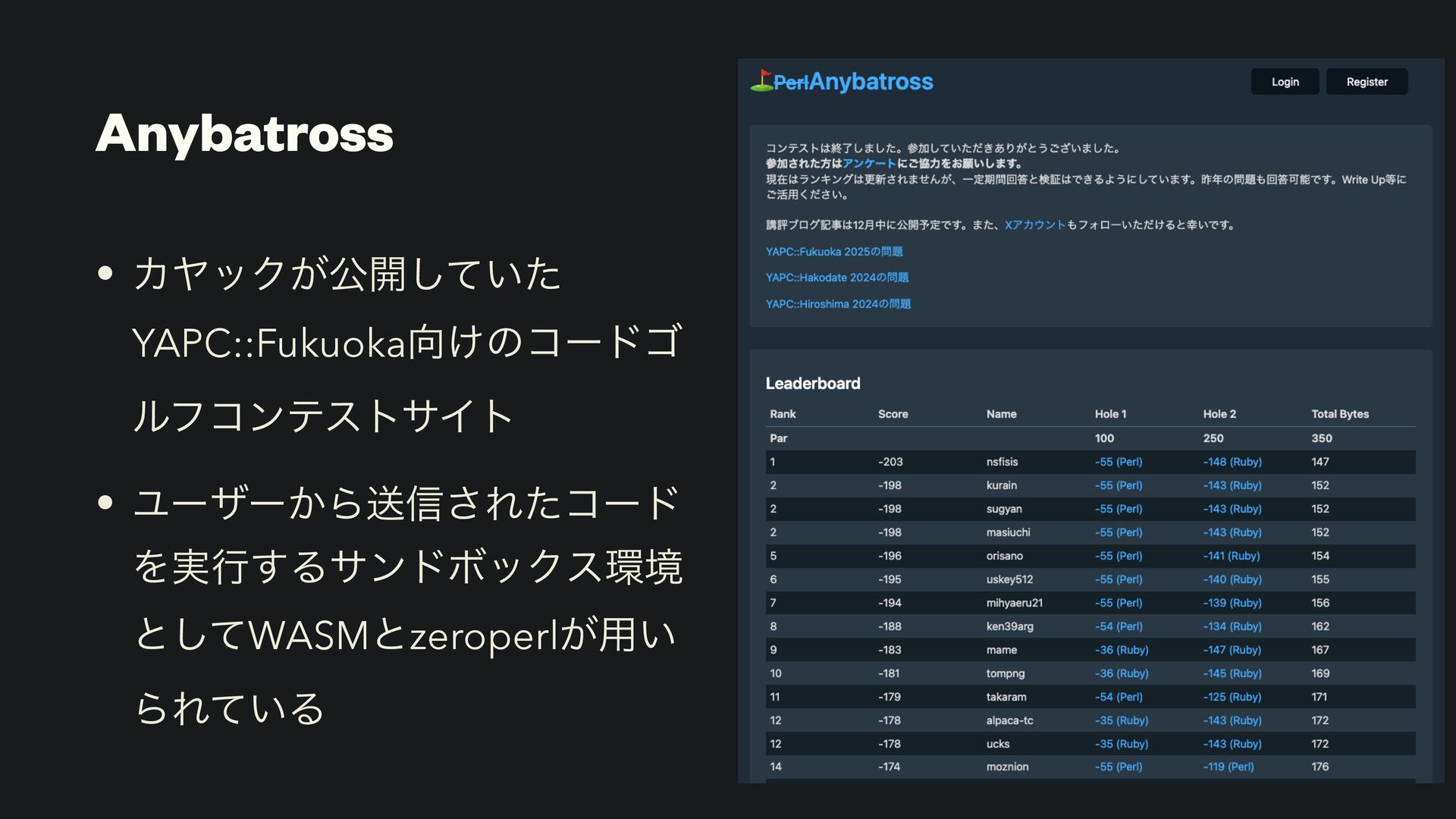 Anybatross • ΧϠοΫ͕ެ։͍ͯͨ͠ YAPC::Fukuoka͚ͷίʔυΰ ϧϑίϯςεταΠτ • Ϣʔβʔ͔Βૹ৴͞Εͨίʔυ Λ࣮ߦ͢ΔαϯυϘοΫεڥ ͱͯ͠WASMͱzeroperl͕༻͍ ΒΕ͍ͯΔ