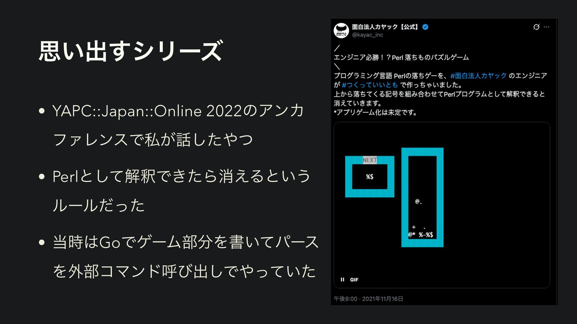 ࢥ͍ग़͢γϦʔζ • YAPC::Japan::Online 2022ͷΞϯΧ ϑΝϨϯεͰࢲ͕ͨͭ͠ • Perlͱͯ͠ղऍͰ͖ͨΒফ͑Δͱ͍͏ ϧʔϧͩͬͨ • ࣌GoͰήʔϜ෦Λॻ͍ͯύʔε