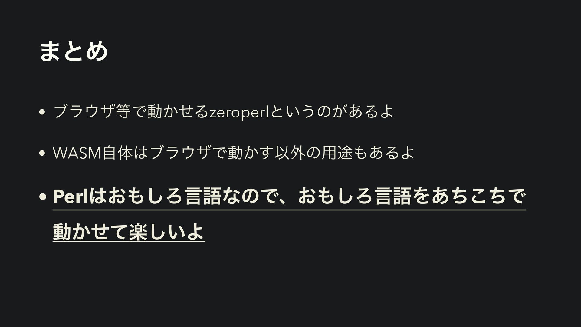 ·ͱΊ • ϒϥβͰಈ͔ͤΔzeroperlͱ͍͏ͷ͕͋ΔΑ • WASMࣗମϒϥβͰಈ͔͢Ҏ֎ͷ༻్͋ΔΑ • Perl͓͠ΖݴޠͳͷͰɺ͓͠ΖݴޠΛ͋ͪͪ͜Ͱ ಈָ͔͍ͤͯ͠Α