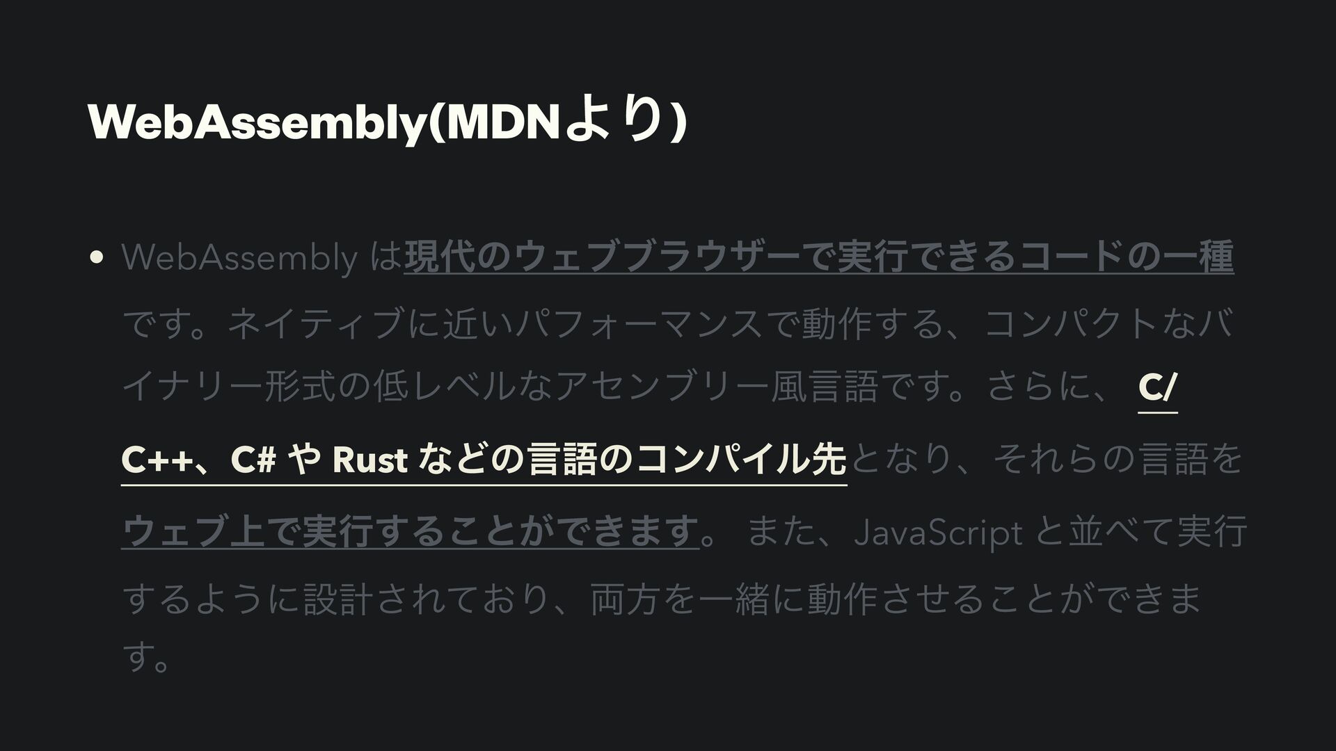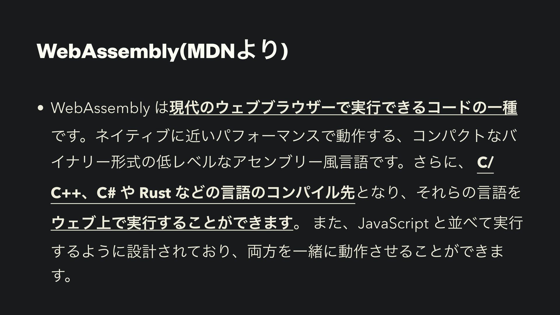 WebAssembly(MDNΑΓ) • WebAssembly ݱͷΣϒϒϥβʔͰ࣮ߦͰ͖ΔίʔυͷҰछ Ͱ͢ɻωΠςΟϒʹ͍ۙύϑΥʔϚϯεͰಈ࡞͢ΔɺίϯύΫτͳό ΠφϦʔܗࣜͷϨϕϧͳΞηϯϒϦʔ෩ݴޠͰ͢ɻ͞Βʹɺ C/ C++ɺC# Rust