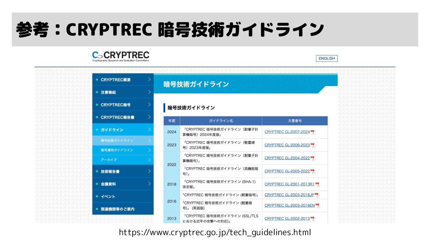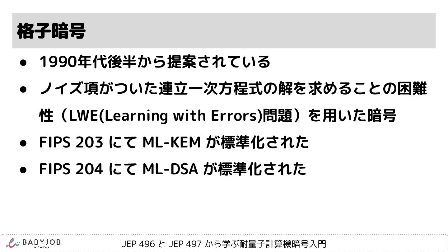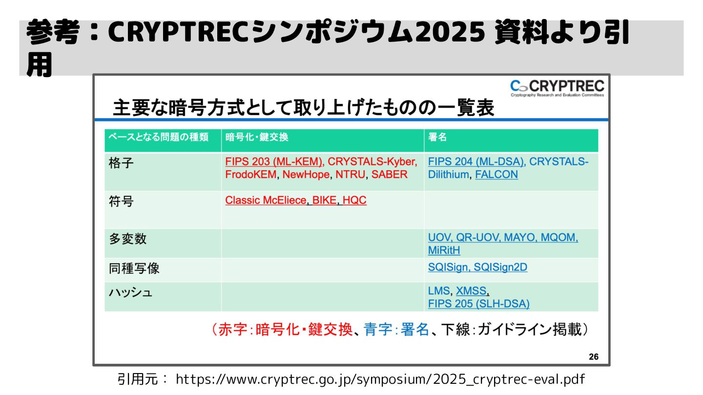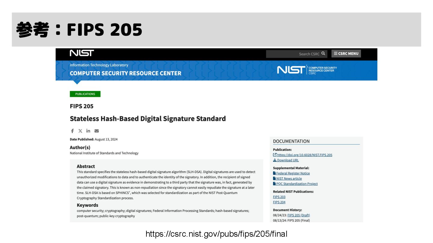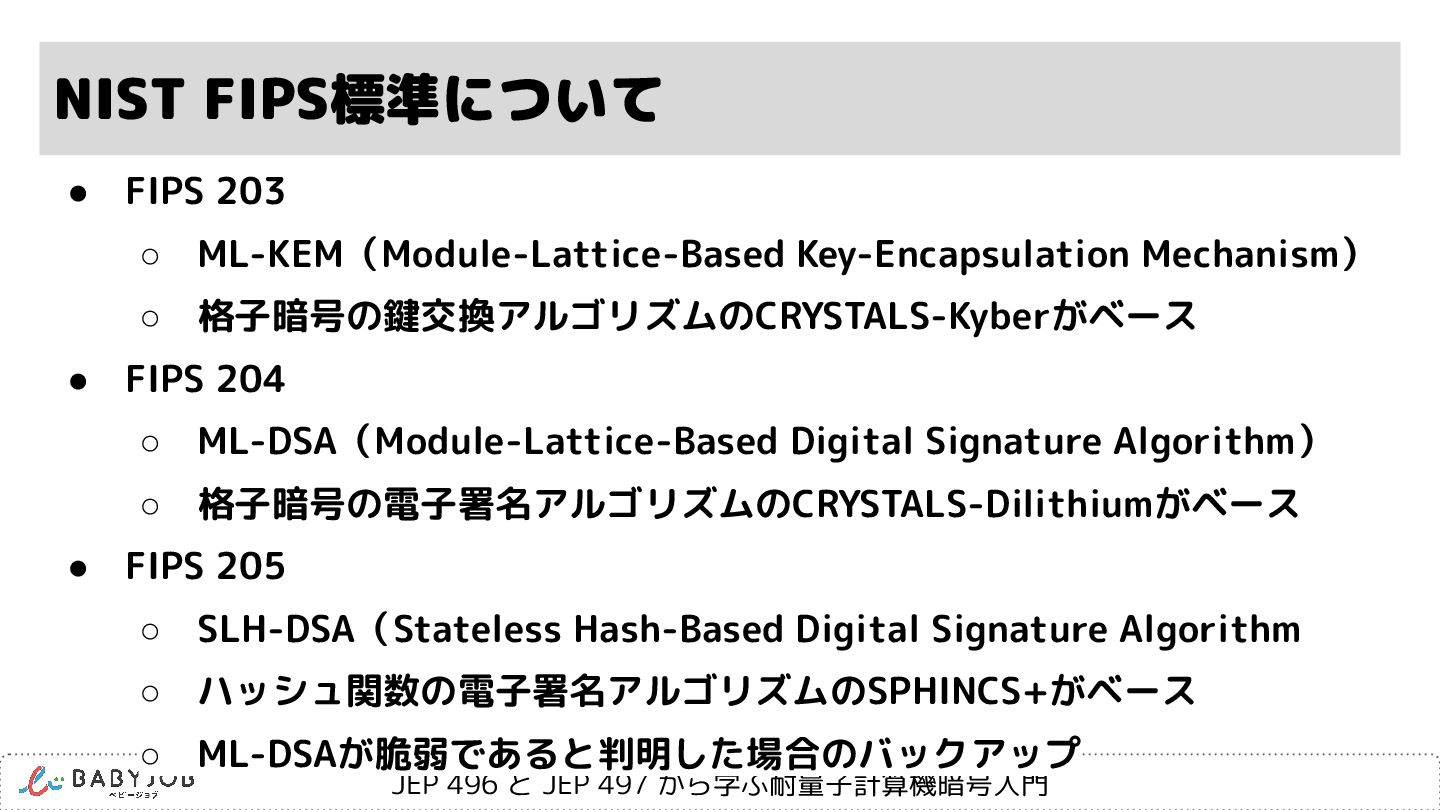 203 ◦ ML-KEM(Module-Lattice-Based Key-Encapsulation Mechanism) ◦ 格子暗号の鍵交換アルゴリズムのCRYSTALS-Kyberがベース • FIPS 204 ◦ ML-DSA(Module-Lattice-Based Digital Signature Algorithm) ◦ 格子暗号の電子署名アルゴリズムのCRYSTALS-Dilithiumがベース • FIPS 205 ◦ SLH-DSA(Stateless Hash-Based Digital Signature Algorithm ◦ ハッシュ関数の電子署名アルゴリズムのSPHINCS+がベース ◦ ML-DSAが脆弱であると判明した場合のバックアップ