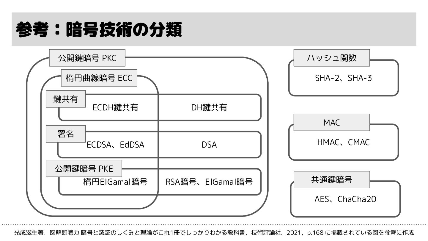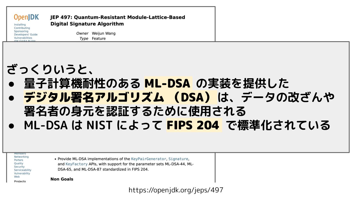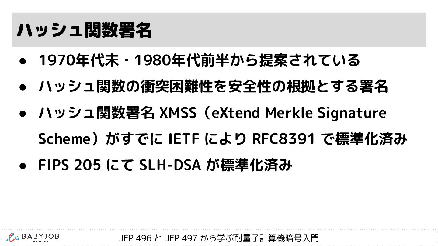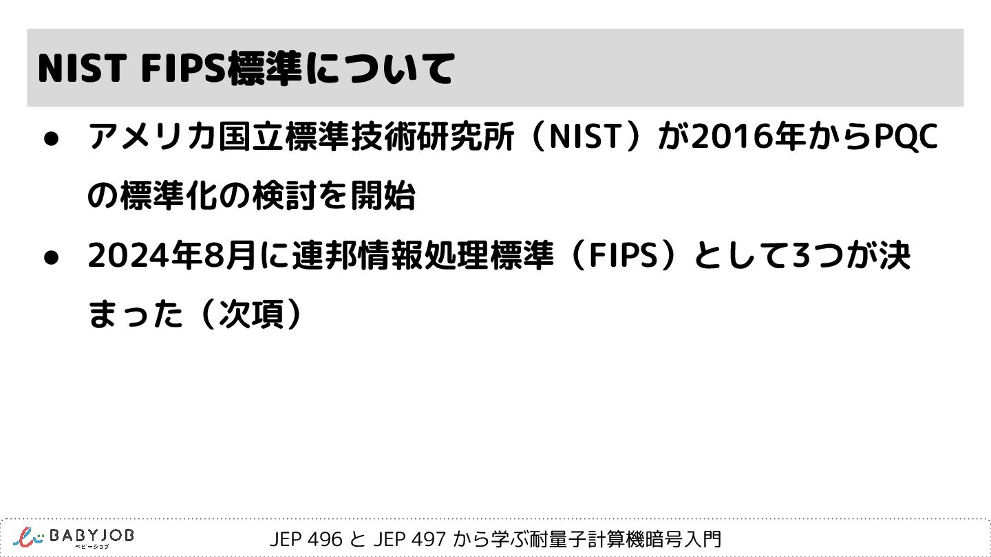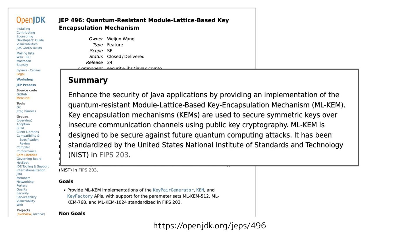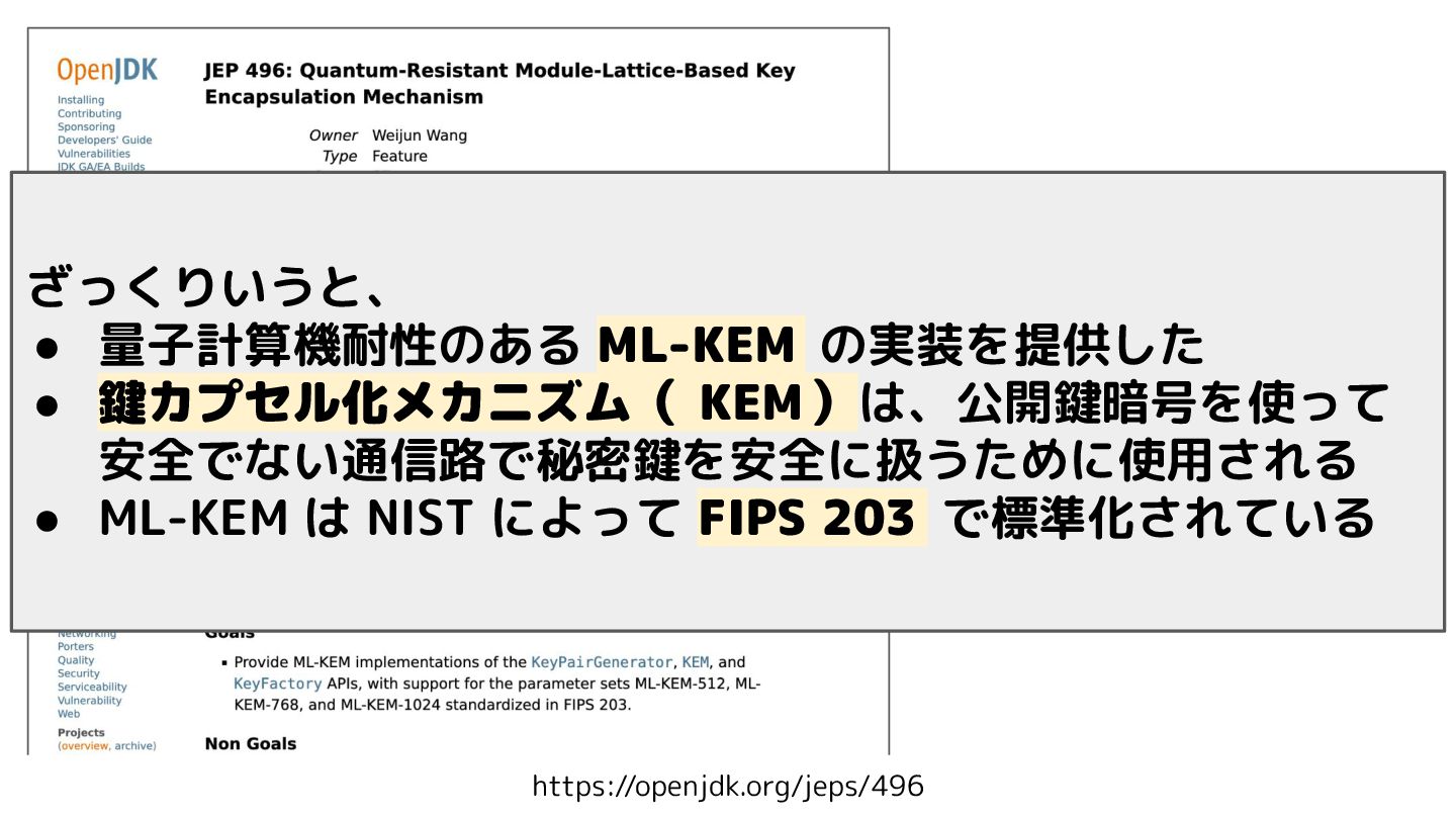 203 ◦ ML-KEM(Module-Lattice-Based Key-Encapsulation Mechanism) ◦ 格子暗号の鍵交換アルゴリズムのCRYSTALS-Kyberがベース • FIPS 204 ◦ ML-DSA(Module-Lattice-Based Digital Signature Algorithm) ◦ 格子暗号の電子署名アルゴリズムのCRYSTALS-Dilithiumがベース • FIPS 205 ◦ SLH-DSA(Stateless Hash-Based Digital Signature Algorithm ◦ ハッシュ関数の電子署名アルゴリズムのSPHINCS+がベース ◦ ML-DSAが脆弱であると判明した場合のバックアップ